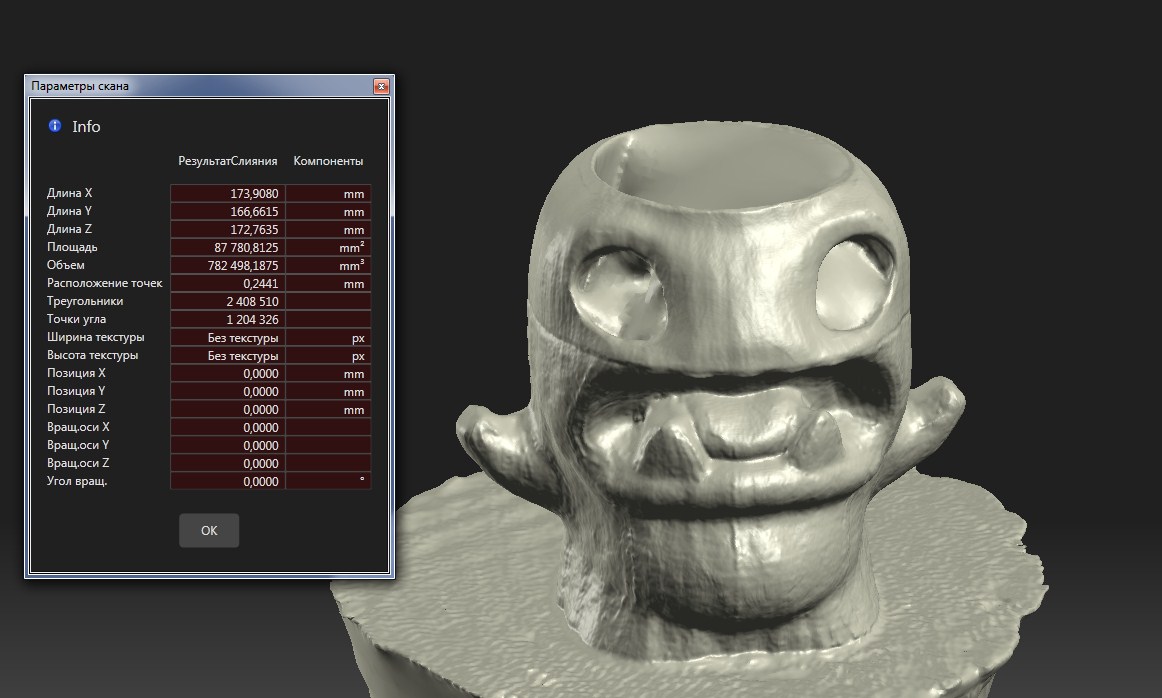 Со всех сторон не стал делать, только лицевую часть и заднюю, но это я понимаю, это уже нормальный результат. От поверхности сканируемого объекта очень многое зависит, поэтому заказал антибликовый спрей, чтобы можно было сканировать прозрачные и глянцевые поверхности.