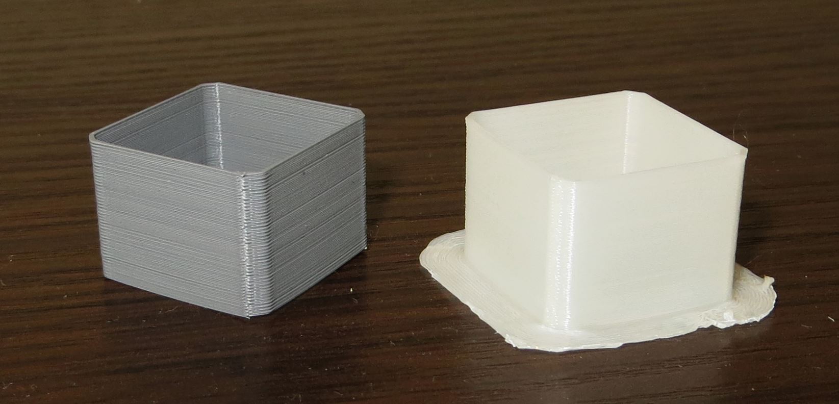 Вот ещё сравнение бесцветного и серого(металлик) пластиков. На Бесцветном все слои нормально скреплены между собой. А на сером металлик - нет бокового склеивания слоёв. Настройки одни и те же. Модель одна и та же. Температура оптимальная для серого пластика - для бесцветного я, обычно, выставлял на 5 градусов меньше, но тут напечатано на одной и той же температуре. У серого пластика, специально, распотрошил сбоку слои - они действительно не склеились.