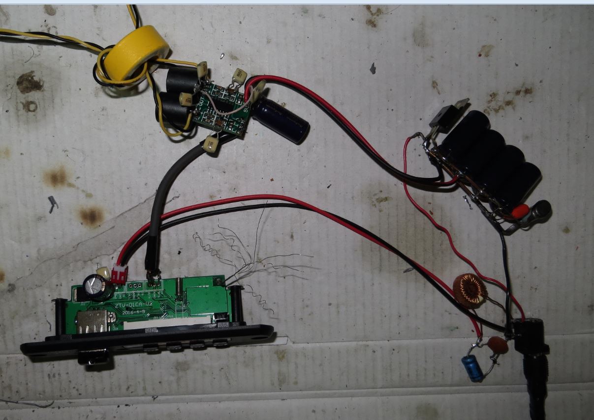 Вот усилок на столе для пайки на TDA7265 - изначально это был усилитель звука в очень дорогом немецком телевизоре, добавил МР3 плеер с USB проигрывателем и фм-радио