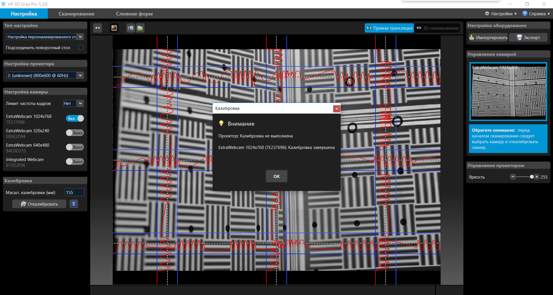 В общем старая версия заработала. Всё откалибровалось норм. В результате сканирования имею ЭТО. Объект матовый. Пробовал ногу подставить, всёравно не качественный скан получается. Откалибровался на разрешении 1080p.