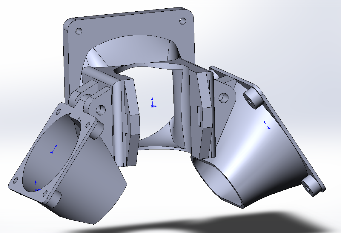 Вентилятором назад не пробовал развернуть? Чтоб сам ветряк под балку убрался? Если не лезет - стоит чуток доработать модель, перевернув центральный воздуходув и подкорректировать крепления боковых. У меня 40мм давно уж по такой схеме прицеплен, но вот боковушку только одну к нему прилепил, в основном хватает.