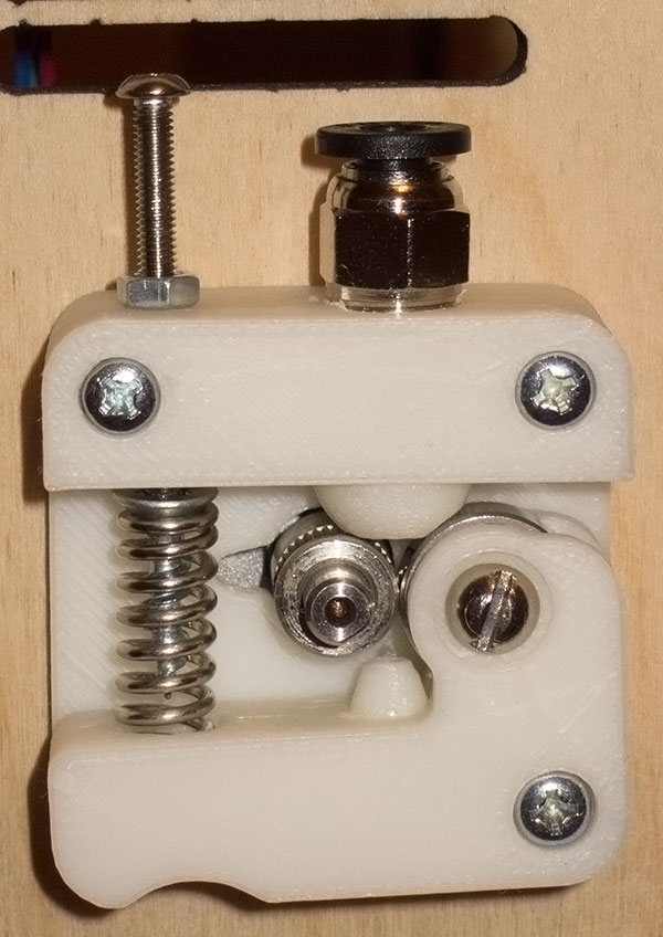Вообще-то, в большинстве наборов есть метчик 4/8х27. Это стандартная резьба во всяком пневмо-вакуумном и холодильном оборудовании. Вот этим метчиком и надо было предварительно нарезать резьбу, и пневмофитинг завинтился бы туда, как родной. :) Можно немного с клеем (циакрином), чтобы не он не вылетел при любых нагрузках. Под винт прижимного ролика тоже нарезается резьба М4 и капается капля циакрина под головку винта.