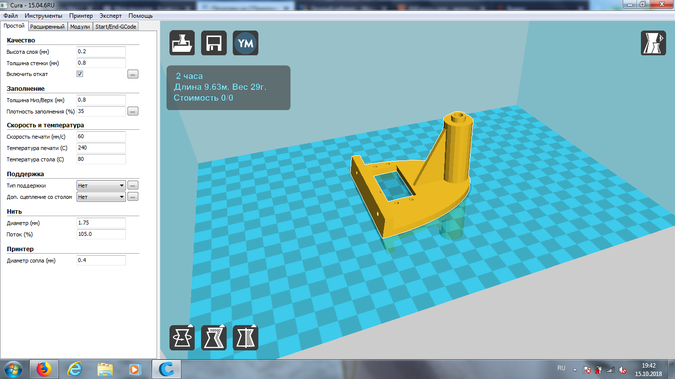 Время печати шестерни на указанных настройках составило 3 часа 39 минут.
