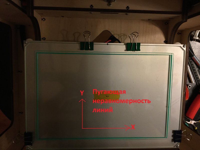 Значит, всё нормально. Нужно проверить параллельность X-балки корпусу, сняв Y-концевик и сдвинув балку назад до упора. Так же нужно проверить параллельность X-рельса горизонтали (чтобы верхняя кромка рельса шла точно вдоль верхней грани уголка Х-балки. Ещё можно проверить затяжку шкивов моторов.