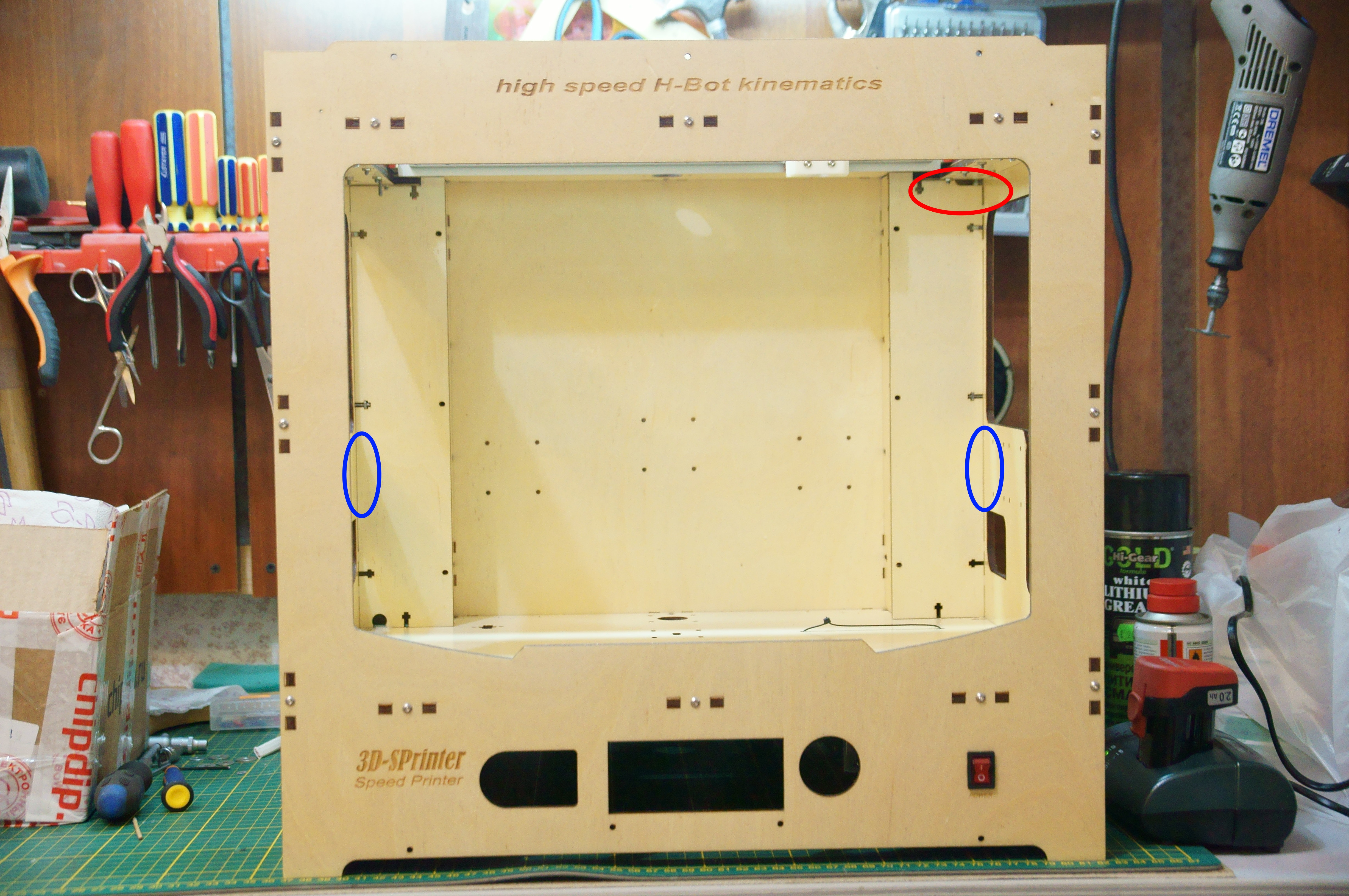 3D-SPrinter, возник один нюансик - у меня вырисовывается, что экструдер с катушкой скорее всего будут на правой стенке (над БП). А вот с "кабель-каналом" в стенке туннеля туго - на правой только сверху (красным), на левой снизу под гофру. Может имеет смысл прорезать за экструдером (синим)?