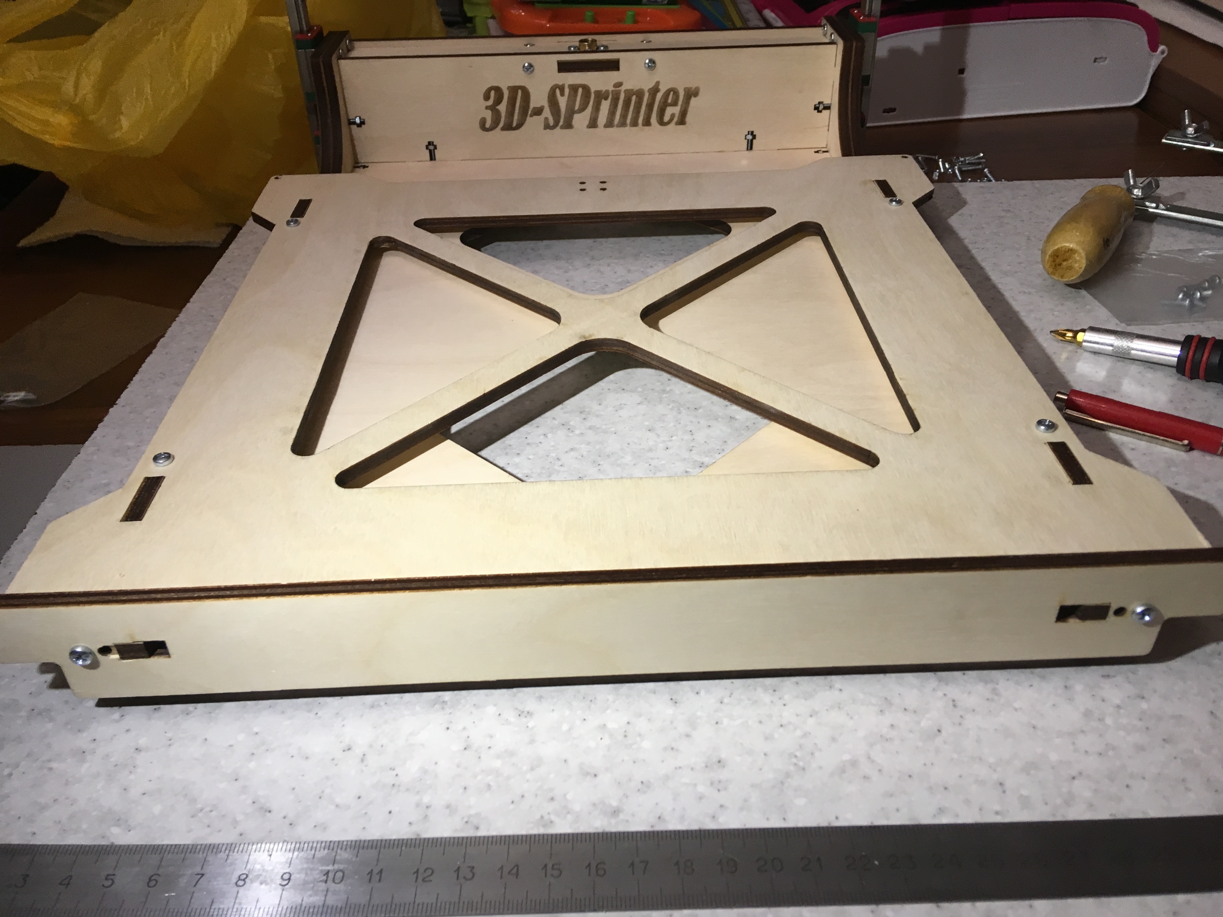 Итоги сборки стола. Подогнал переднюю планку, которая была сделана под старую версию стола. Ручной лобзик, надфиль и шуруповерт со сверлом 3мм - наше всё :lol: