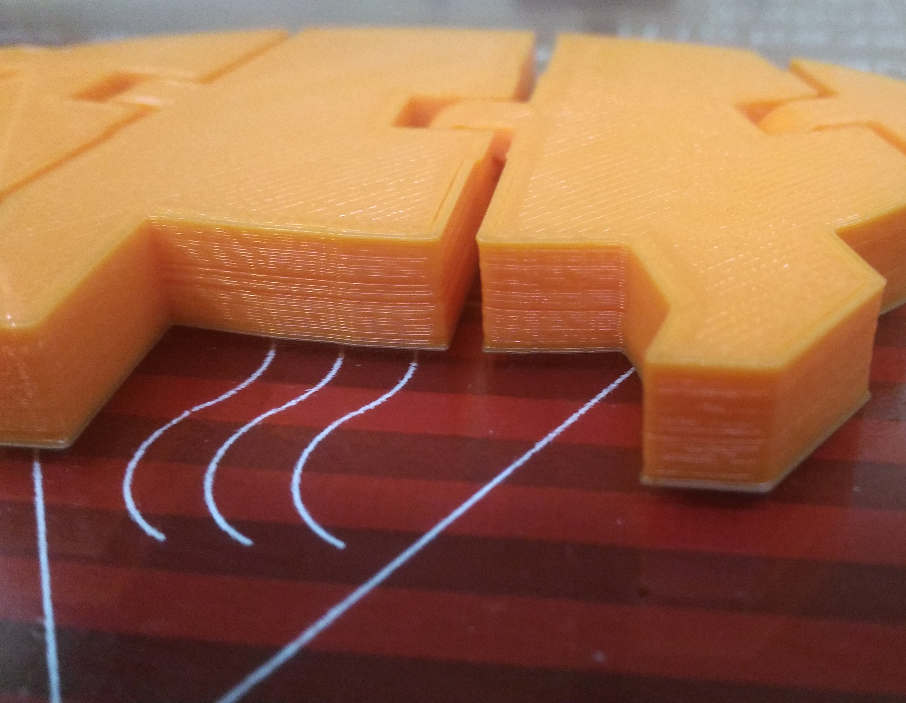 PLA поток 105% скорость 70 выкрученная до 110%, скорость крыши/дна 35 мм/с (на ABS менее выражено, поток 107%) - пропуски, вернее не жирные линии, и чаще всего на внутренней линии стенки. Экструдер подтянул, на первом слое дает жирную линию, но не равномерно, некоторые получаются тоньше. Слои вроде ложатся ровно: