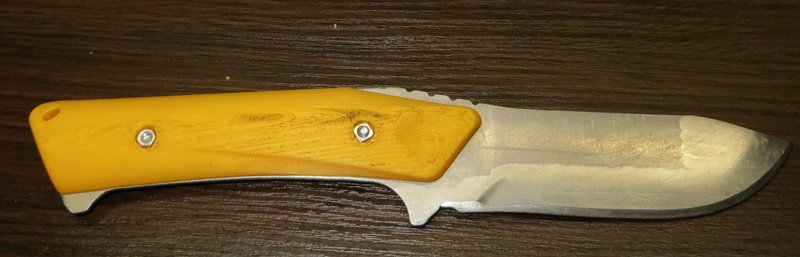 А ручка напечаталась классно с фактурой под дерево......... Так то ручка у ножа из ценных пород дерева и лезвие анодировано.......... А на фото полуфабрикат лезвия на примерку.