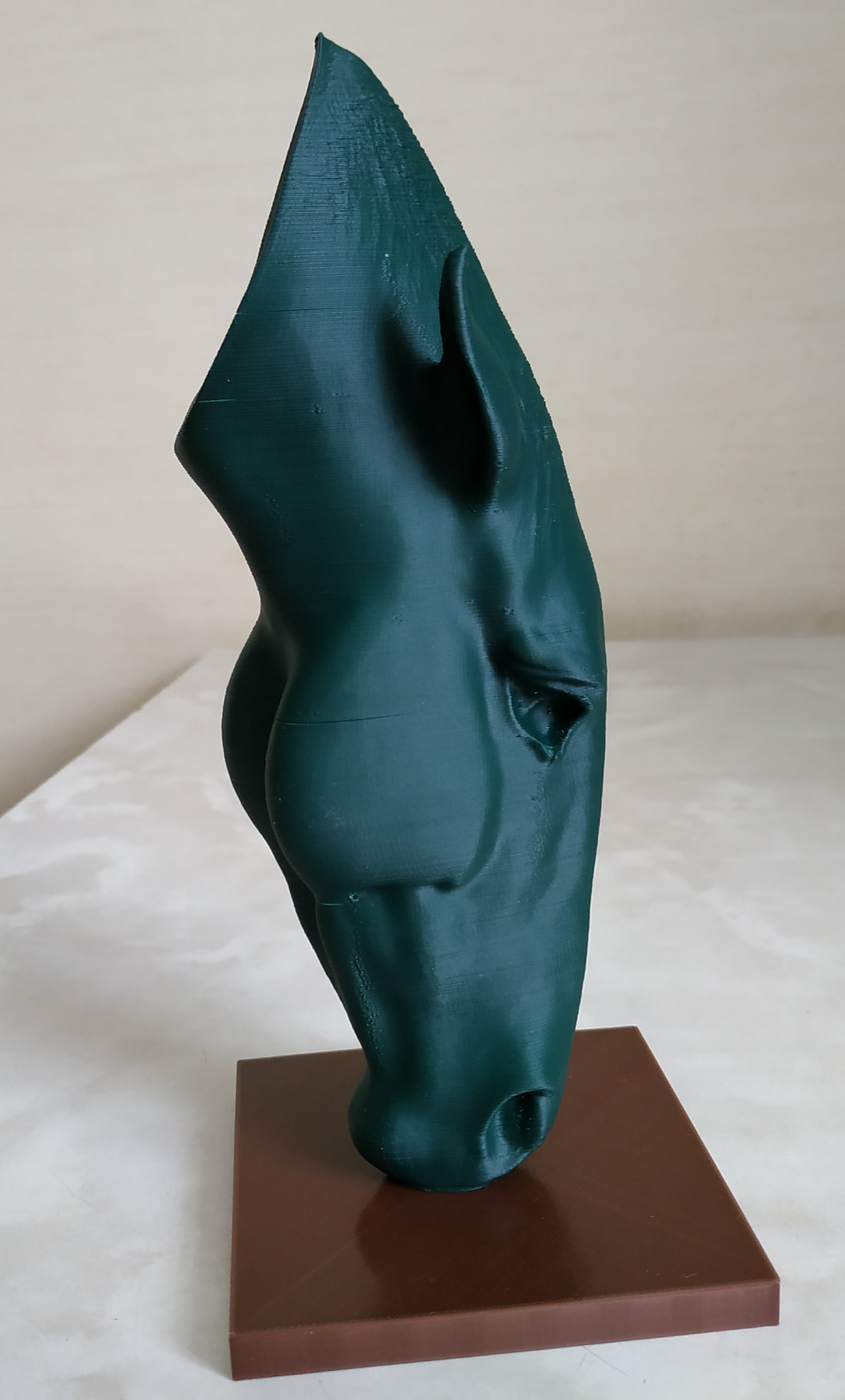 Подходящего цвета близкого к оригинальному цвету в палитре PLA в FD Plast нет, В палитре цветов у них все цвета яркие, насыщенные. Ранее я уже печатал статую из HIPS (с внутренним заполнением) высотой 180 мм и напечатанная статуя была целая, не порвало. Думаю, что влияет каким соплом печатать статую, предыдущую статую печатал соплом 0.6 мм и скорость печати чуть ниже была. Из-за этого слои крепче были. На голове лошади трещины в слоях есть, но они не большие и в фоне тёмно зелёного пластика они еле заметны.