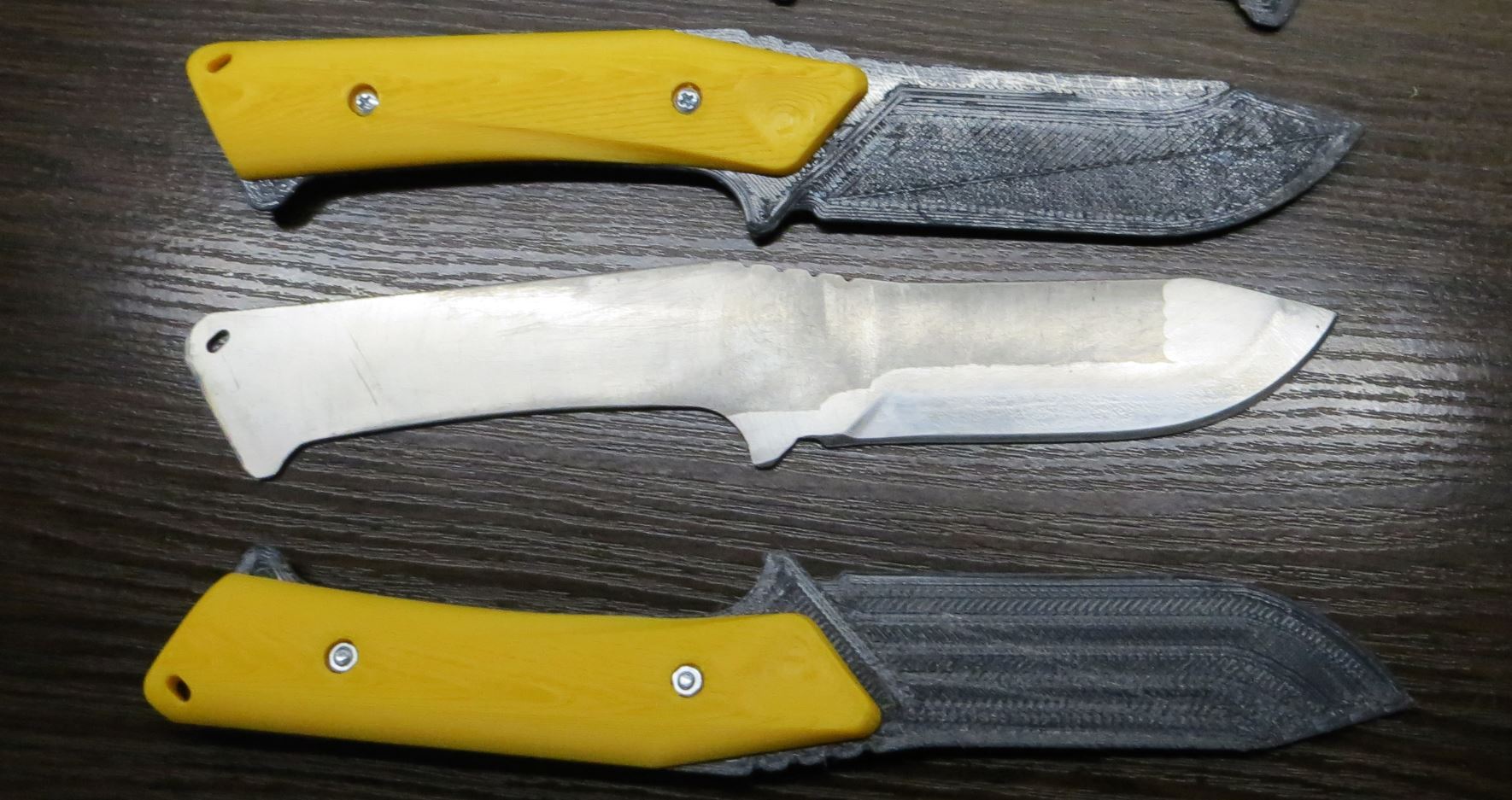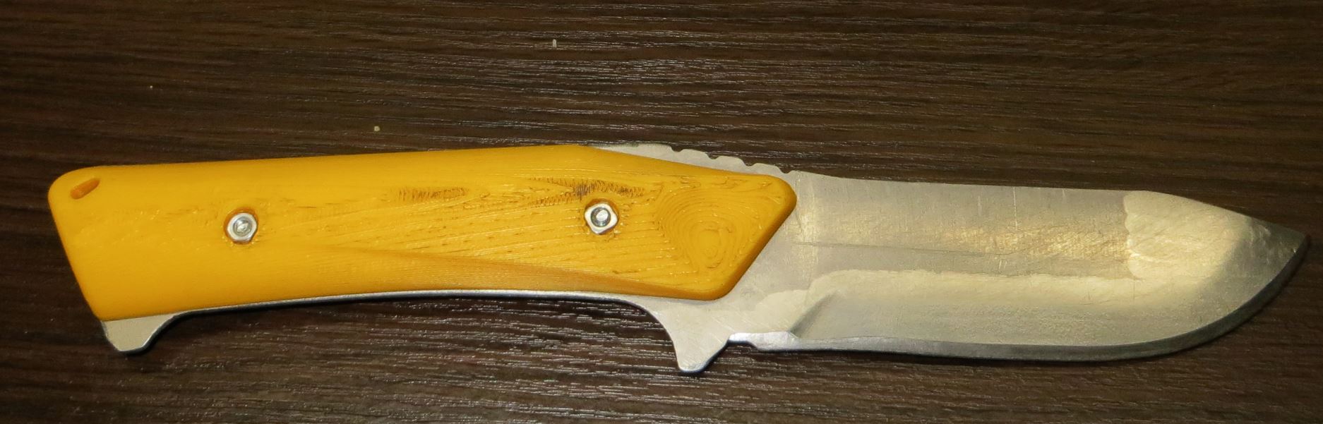 А ручка напечаталась классно с фактурой под дерево......... Так то ручка у ножа из ценных пород дерева и лезвие анодировано.......... А на фото полуфабрикат лезвия на примерку.
