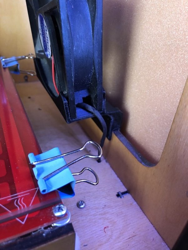 Переделал обдув стола .вентилятор 90х25 мм с шурупами не стал заморачиваться просто приклеил ( вентилятор ) на ребро и так плотно встает печатал АБС.
