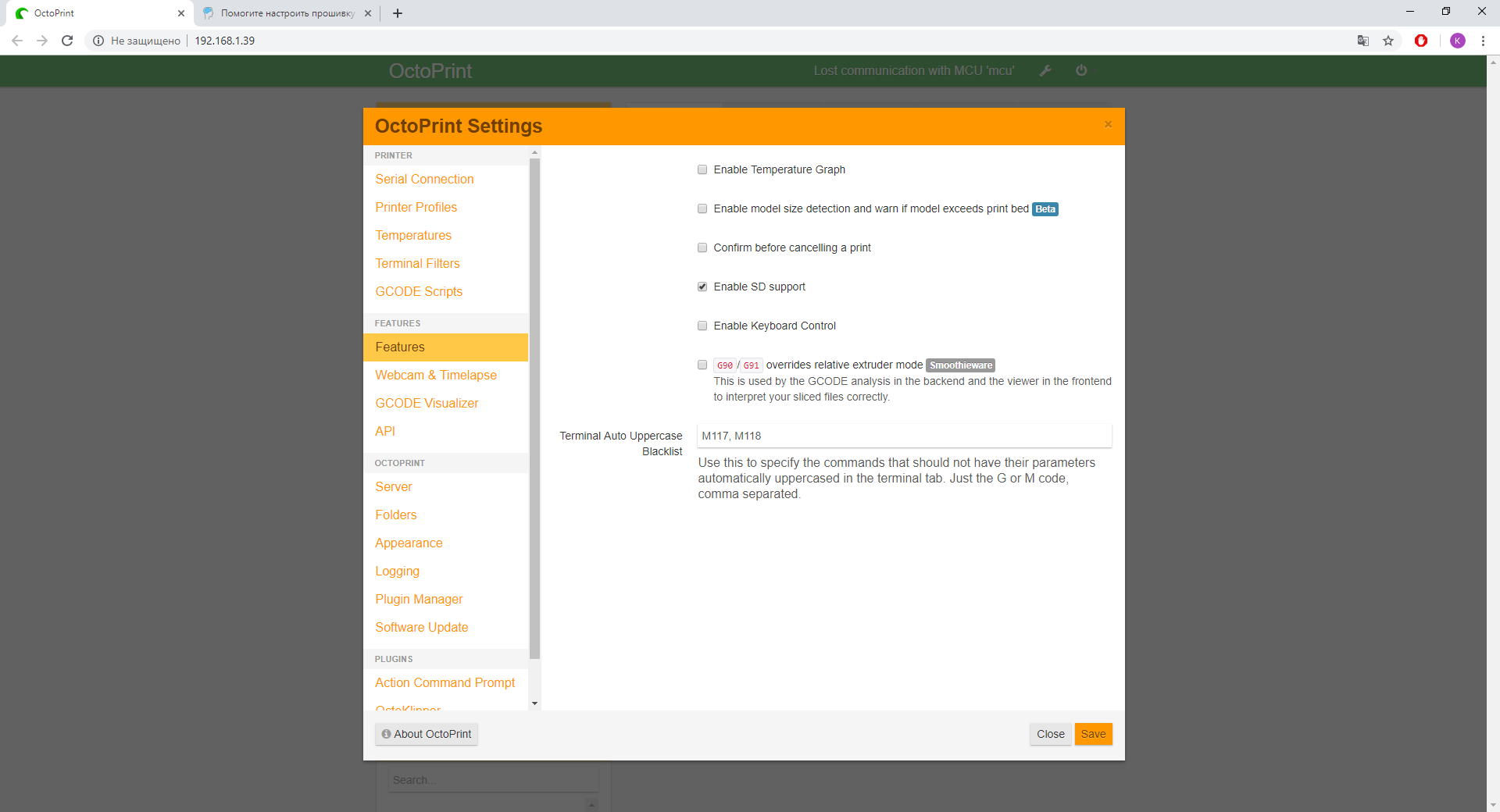 но есть в этом способе косяк )))) если при этом всем выключить сам принтер (у меня питание по USB вырублено), в тот момент пока кнопка "Upload to Sd" активна и начать грузить файл... octoprint зависает. лучше эту кнопку не трогать, а грузить через "Upload" )))))) но я через браузер не гружу файлы... так что для меня это не актуально ))