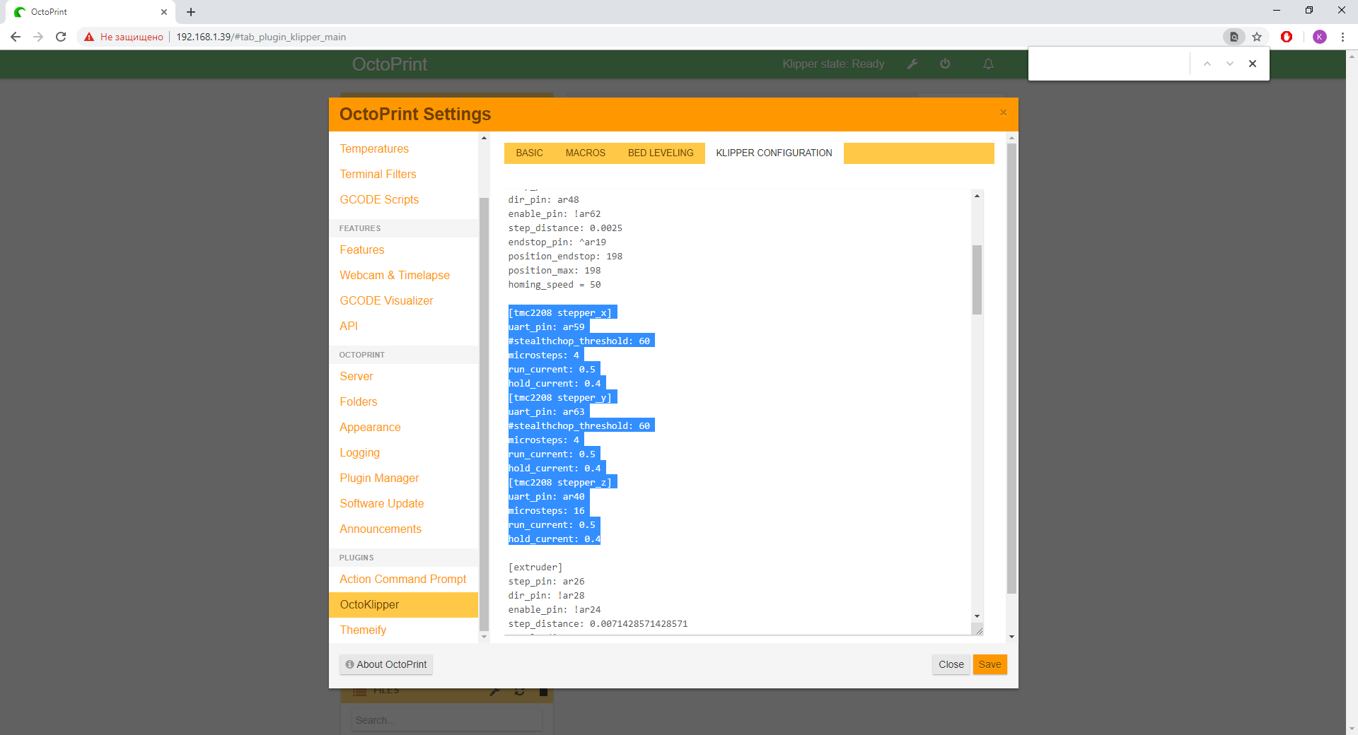 поставил драйвера TMC2208, чисто для эксперимента поставил на все оси. Все подключены по UART. один провод на каждый драйвер (uart_pin).
