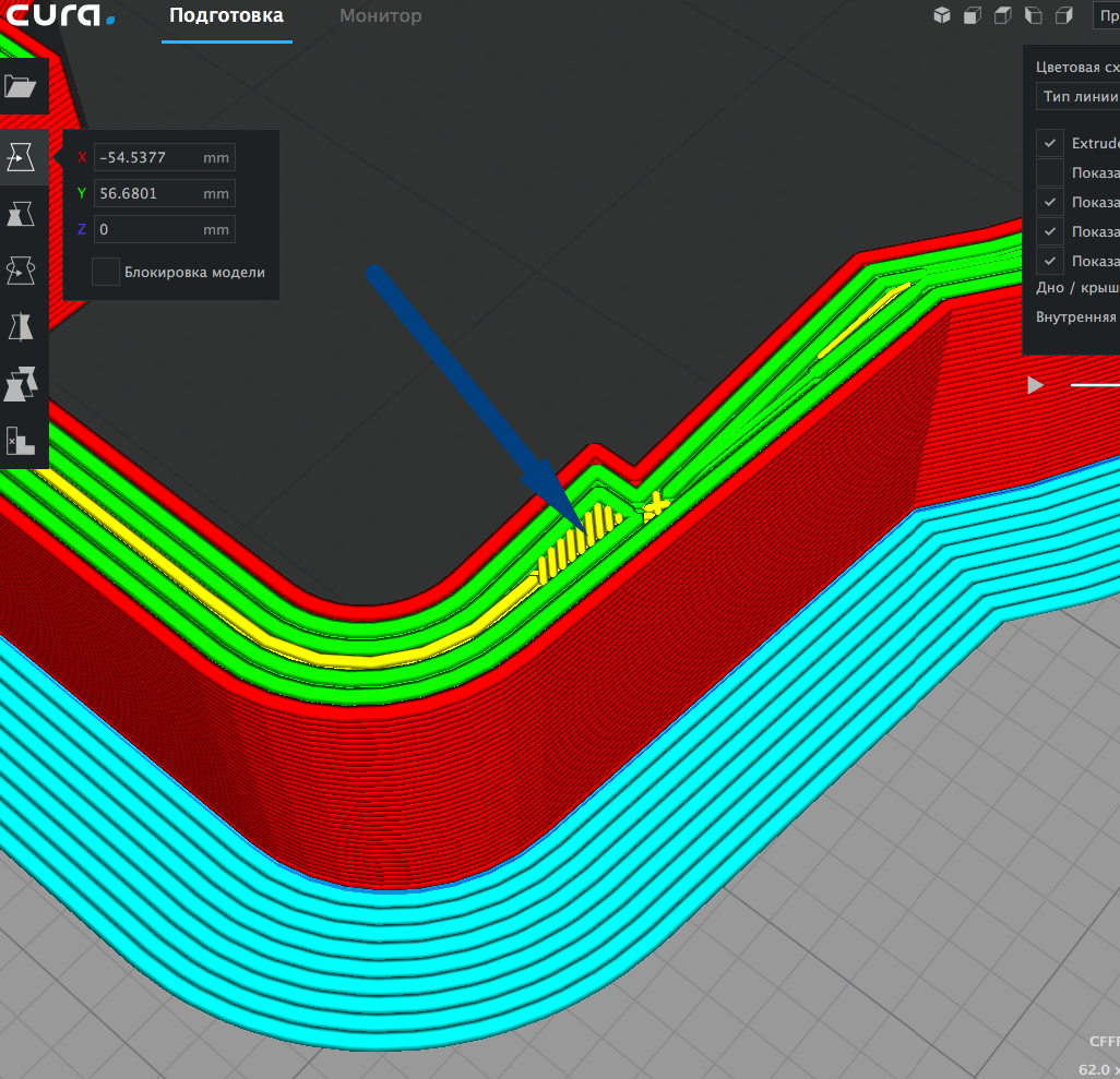 И заодно вопрос: как в CURA избавиться от этих линий стен (желтый)? Это они сбивают шаги по оси Y