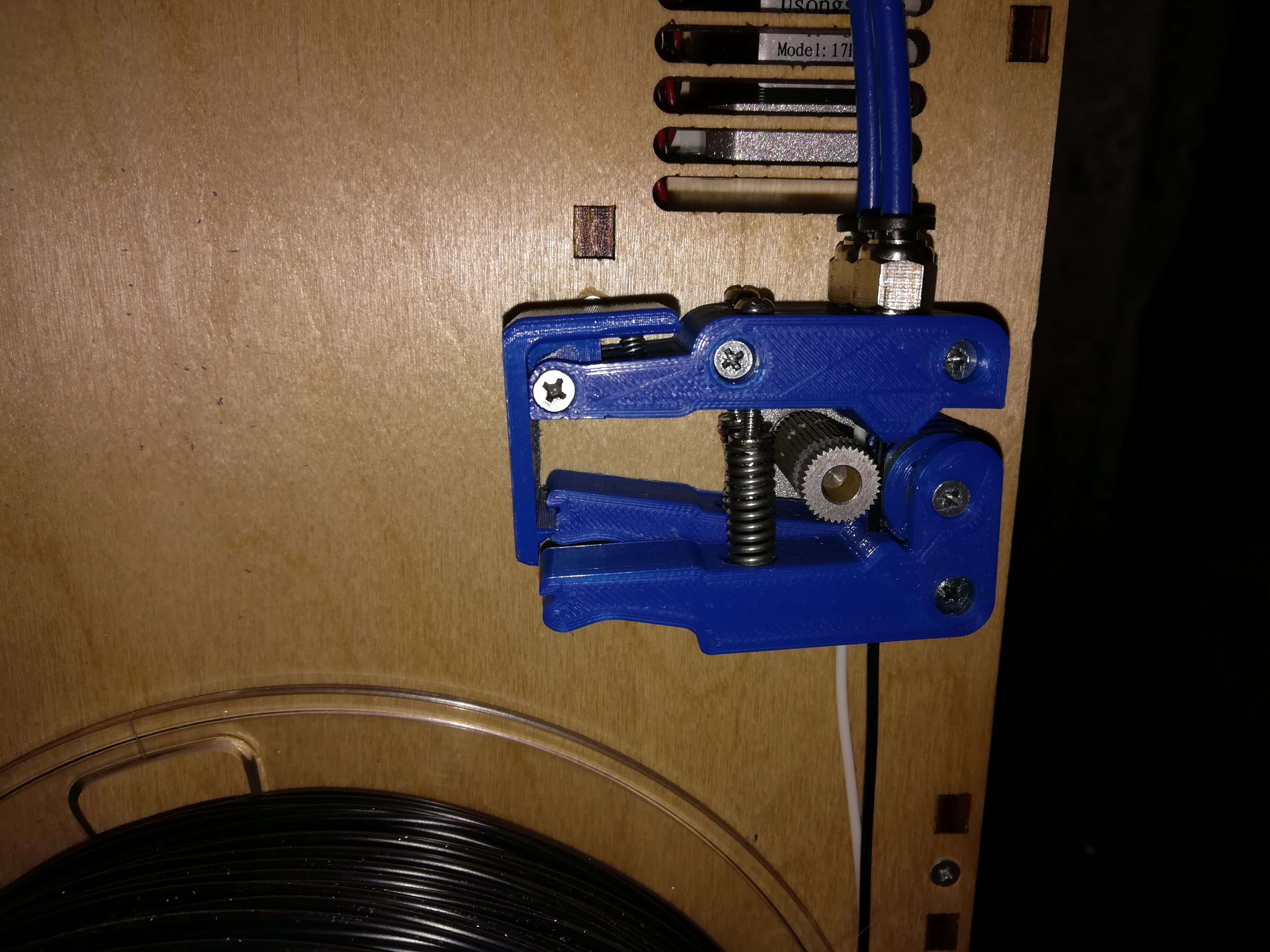 Экструдер один, на рычажок руками (на один нажимаешь другой автоматически отщелкивается), цвет могу поменять только по слоям, за пару секунд на паузе, ну плюс откат, подкат (понимаю не совсем полноценная смена, иногда большего и не нужно). Катушку которой не печатаешь можно думаю менять во время печати. Это все пока тестируется, может что то доработаю!