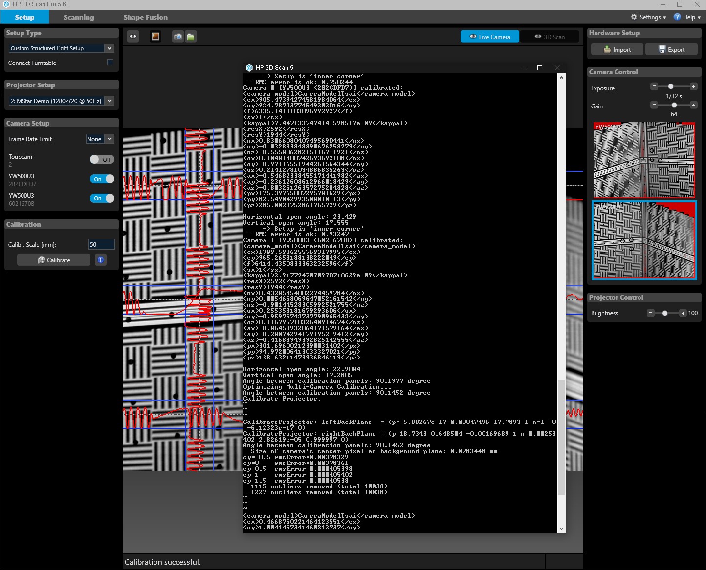 Вот тут результат сканирования калибровочной таблицы в "простом" и "extended" режимах (зелёный - простой, два других - расширенный режим) - видно, что простой режим объединил только "общее" от "видимого" каждой из двух камер.
