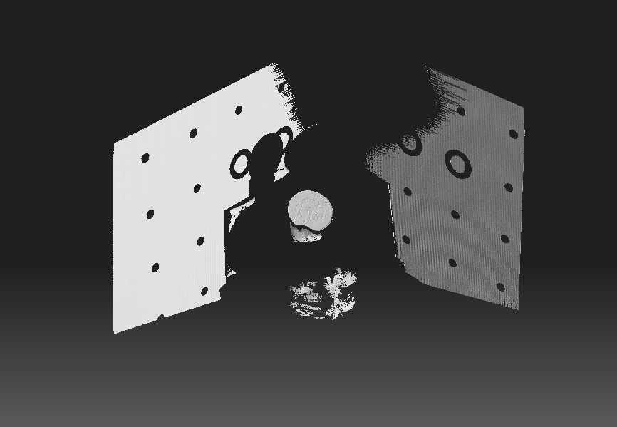 Поставил линзу перед проектором (самую обычную, от "третьей руки"). Удалось подобрать более менее приемлемое расстояние, чтобы я смог сфокусироваться на обычной дистанции 250-300мм. А далее, сделал скан двумя камерами без калибровки (точнее, калибровка была сделана ранее, без линзы и по крупной 50мм таблице). Одна камера такого не пережила бы (искажения формы просто дикие), а вот композитный режим переварил, и очень даже классно. Видео позже выложу. А пока немножко картинок: