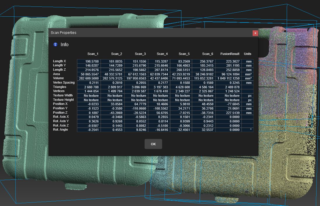 А я себе вчера, наконец-то, сделал более крупную таблицу 110мм (по листу А4 на каждую сторону), после этого чемоданчик от фена стал "влезать в кадр" уже почти наполовину... и всплыла другая проблема - каждый скан содержал примерно 5-6 миллионов треугольников - и 8Гб памяти были "прям на пределе"... уже при 6-ти сканах... пришлось запускать упрощение, в результате стало 2-4 миллиона на скан: