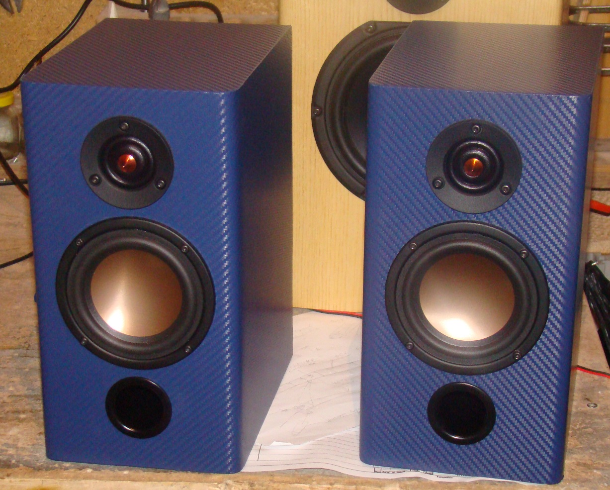 Несмотря на компьютерное моделирование, детали корпуса напилил паркеткой и электролобзиком (быстро и ни к кому бегать не надо), сборка на титебонде и саморезах. Снаружи кабинеты отшпаклеваны акриловой шпаклевкой по дереву, отшкурены шлифмашинкой (в основном), с передней панели ручным фрезером сняты два радиуса, и, для лучшей адгезии самоклейки (автовинил,синий "карбон", 300 руб за 1.5 м2), прогрунтованы БФ-2, разведенным в спирте.