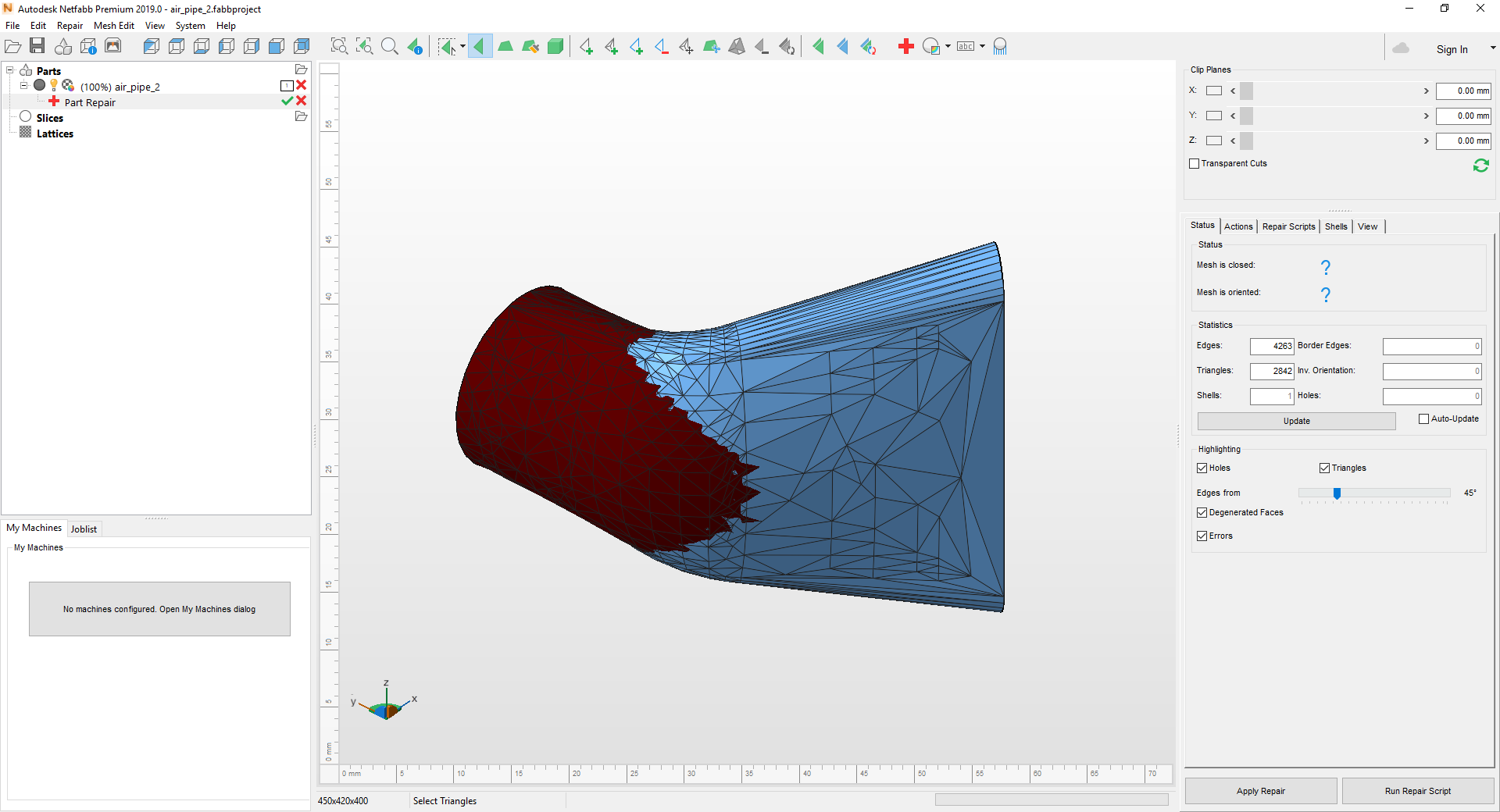 У тебя сама модель (или уже stl) air pipe 2 кривая. slic3r тоже не смог ее нарезать. Скорее всего проблема с поверхностями еще в модели(толщина стенки или самопересечение поверхностей если вытягивал пайп по "сечениям"). Возможно экспортировал неудачно.