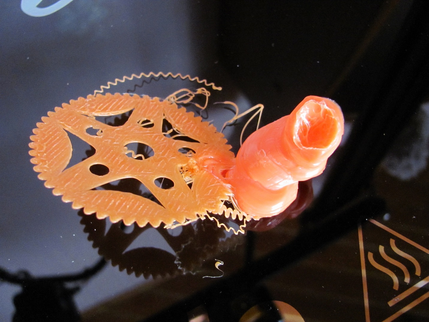 Помогите, пожалуйста, неравнодушные 3-дешники, разобраться в такой проблеме: принтер купил, напечатал с SD-карты подставку для катушки. Потом принтер просто простаивал месяц. --> Начал печатать с ноутбука через simplify3d колёсики для регулировки стола, скачанные с thingiversa: PLA пластик, температуру поставил 205°С, для стола 0°С (Думаю может в этом моя ошибка!? Стол стеклянный без всяких покрытий. Протёр хорошо спиртом перед печатью). Пластик начал просто вылазить и "сворачиваться". Вообщем вот что получилось: