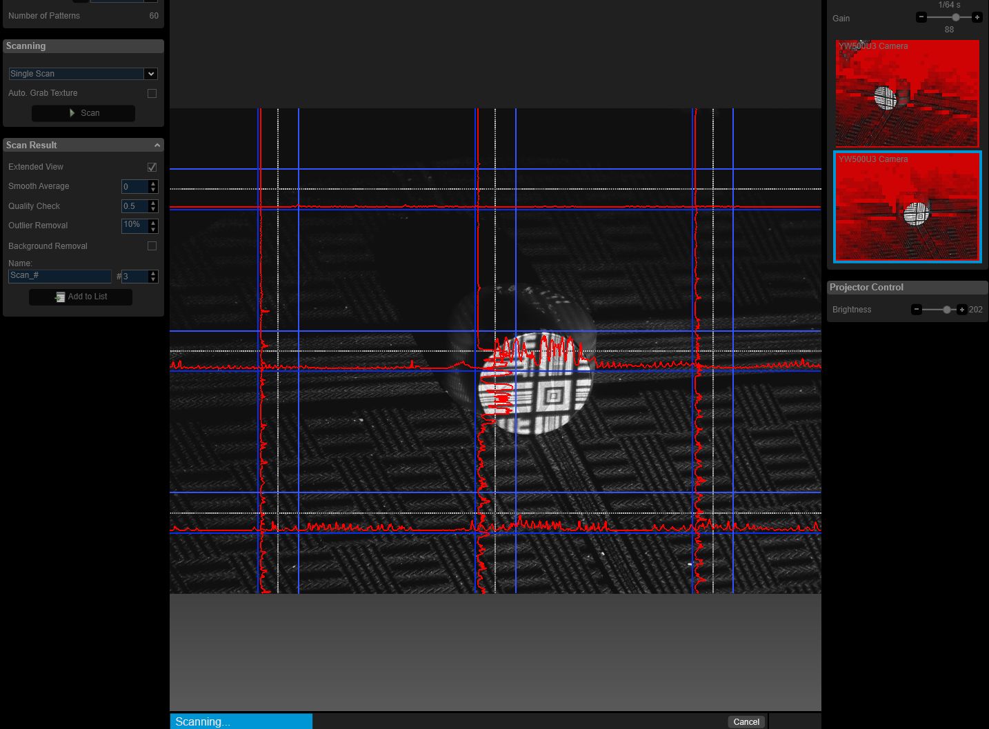 Параметры: 2 камеры - YW500U3 (red) в разрешении 2592x1944; объектив ZLKC HM1214MP5; проектор Byintek UFO R9; таблицы 30 и 110мм; софт - HP3Dscan Pro 5.60; режим сканирования - custom cl+ps (35 паттернов)