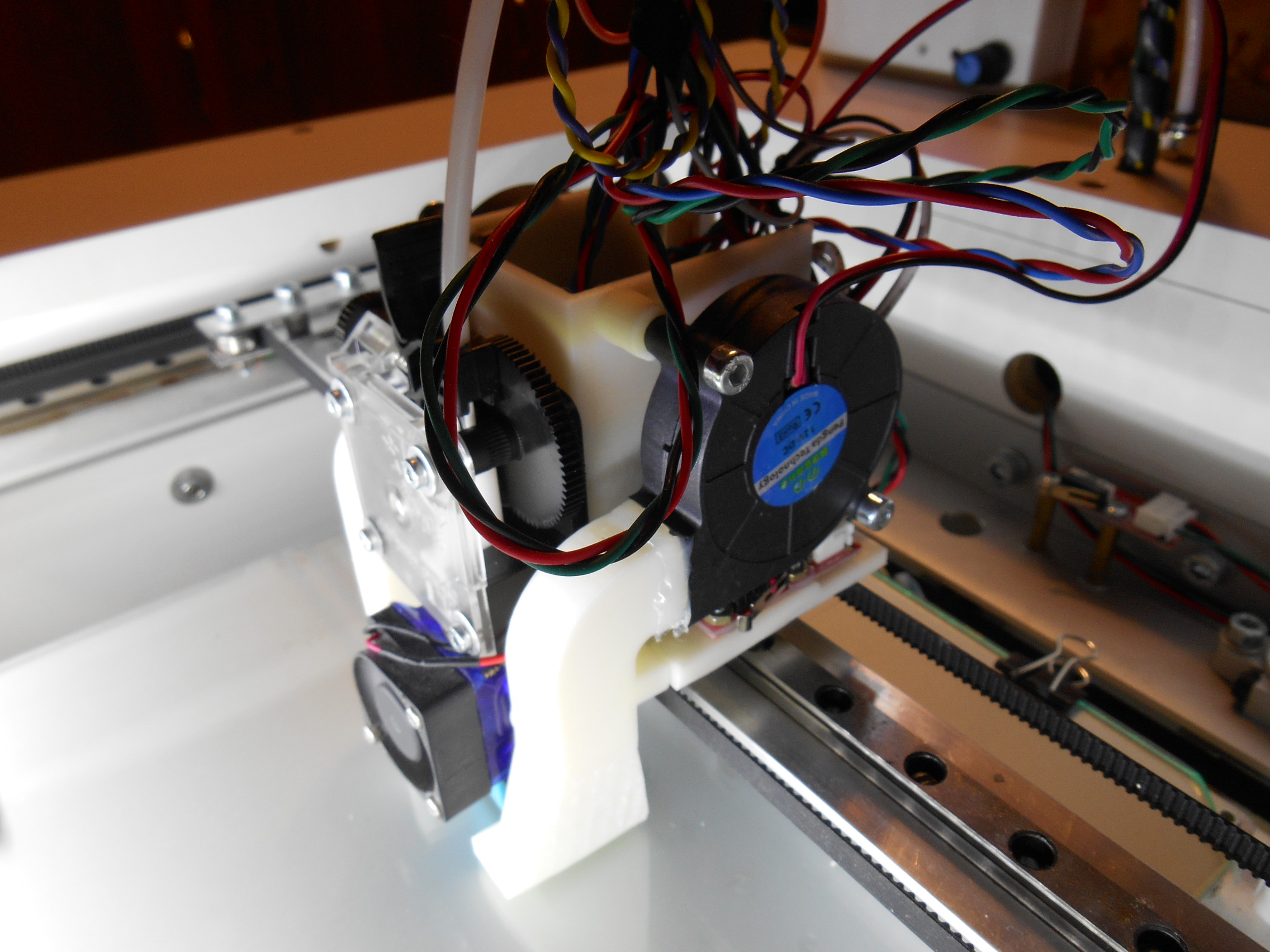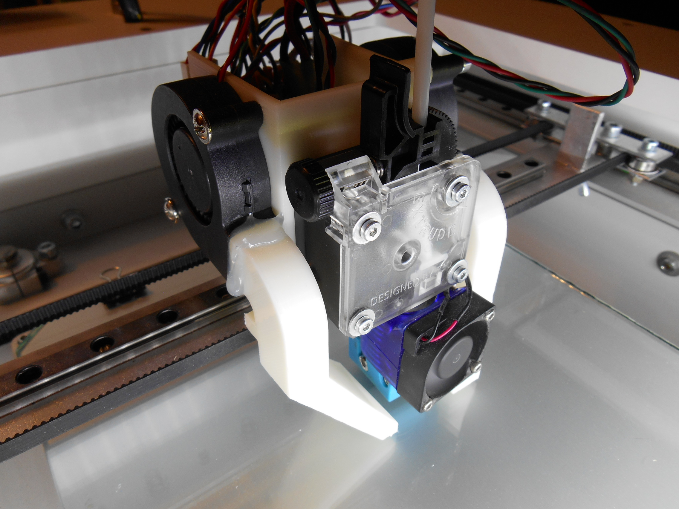 Вообще, как я понимаю, в идеале, наверное, нужно дуть строго под сопло направленным потоком (ПЛА), именно на колбасу горячую, чтобы на кубик и сопло как можно меньше попадало. Но там проблема - уместить сопло между нижней гранью кубика и столом.