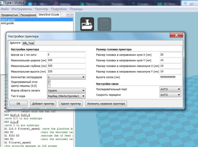 Настройки принтера...Поскольку моей Авроры в куре нет, то параметры вводились самостоятельно