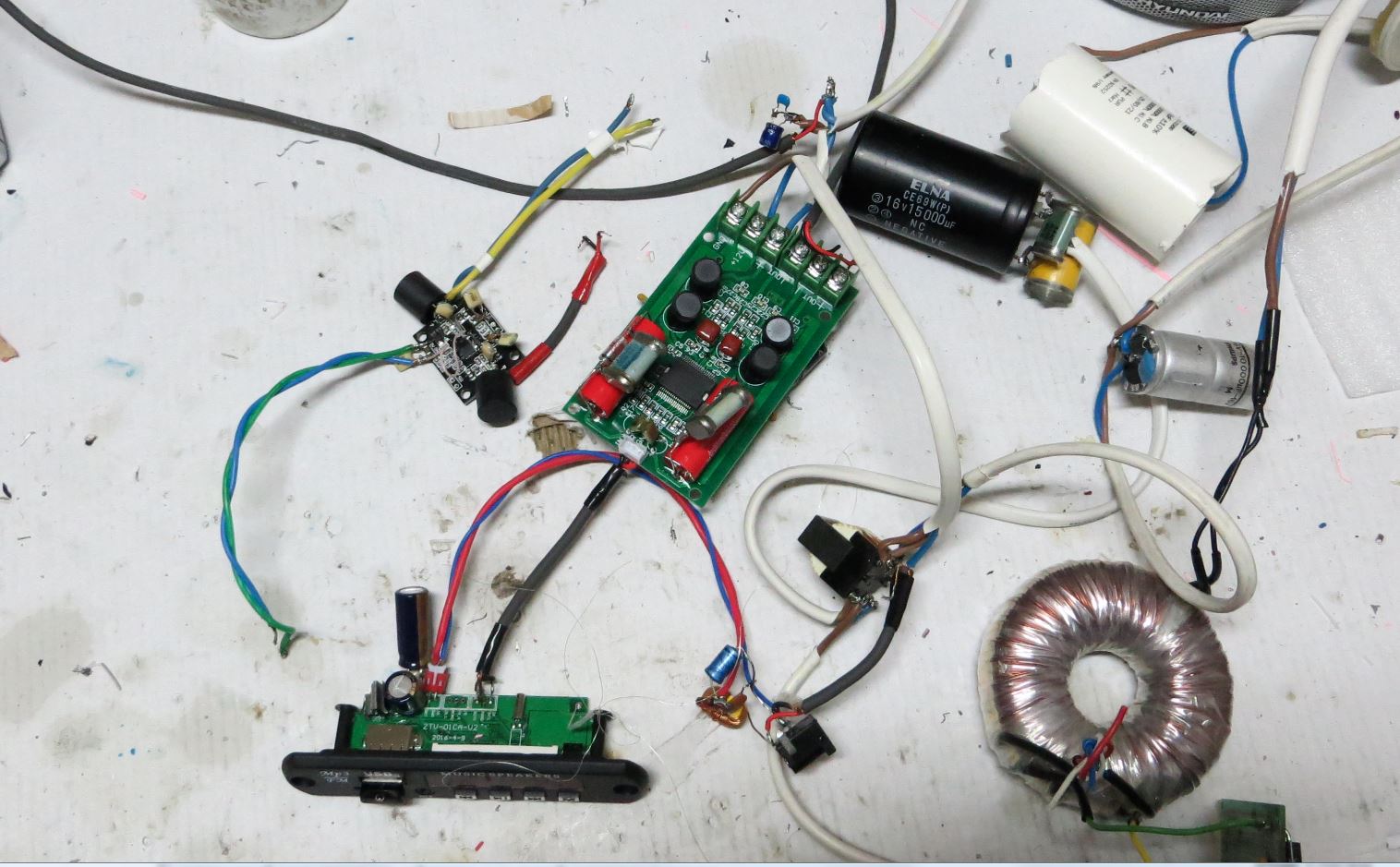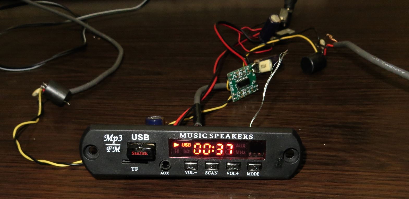 Но вот меня дернули послушать в магазине БЛЮ -туз колонки. Товарищ хотел на дачу купить. Мы послушали штук семь - все какие были. Короче все играют крайне дерьмово. Я ему предложил купить на блошином рынке стереомагнитолу с нормальными динамиками и усилителями и туда воткнуть вот этот модуль с флеш плеером. Ну и купили такой модуль у нас они в разнице продаются, правда в два раза дороже, чем самому заказать. Модуль купили за 250 рублей и магнитолу за 100 рублей (без шнура). Нашли даташит на микросхему усилителя в магнитоле в интернете и на вход усилителя припаяли выход с этой платки - в магнитоле стол маленький трансформатор и она может от батареек работать. Но туда воткнули литиевый аккумулятор с платой зарядки от USB разъёма. - но тоже сделаи заряд от внутреннего трансформатора , с включением через один из выключателей , ранее используемый для переключения режимов - радио фм, радио дв, магнитофон.