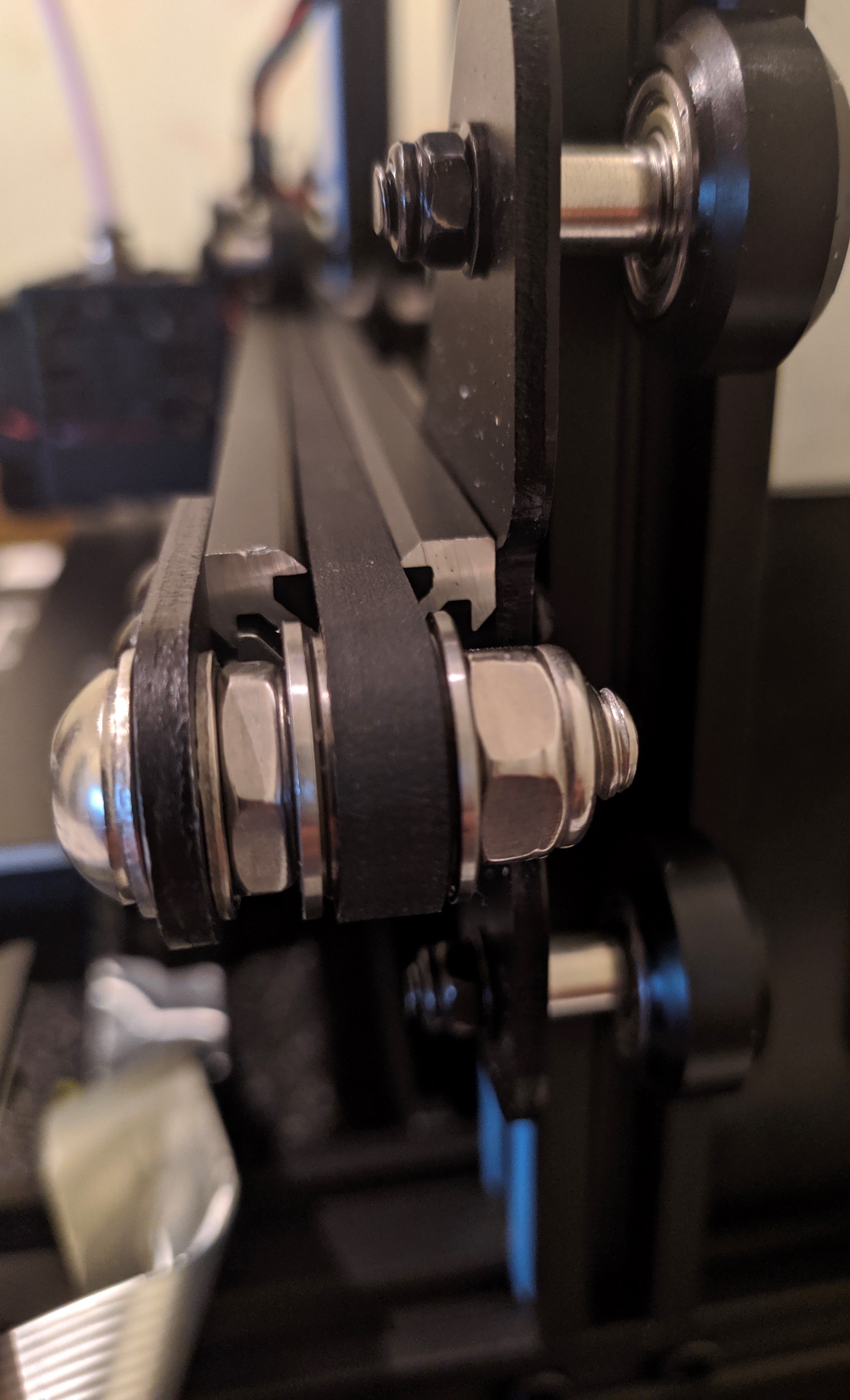 Привет всем! собрал A10М, выставил стол, и тут обнарули проблему. Экструдер просидает при движении по направляющей оси Х в центре. Т.е. в центре печати экструдер всегда ниже чем по краям. Как я понима связанно это с тем что роллики на которых двигаеться экструдер ложаться не на правляющие а на ремень который у краёв их выталкивает а в середине просидает. Как я понимаю ремень должен быть ниже чтобы не касаться ролликов. На фото видно что ремень чуть выше направляющих.