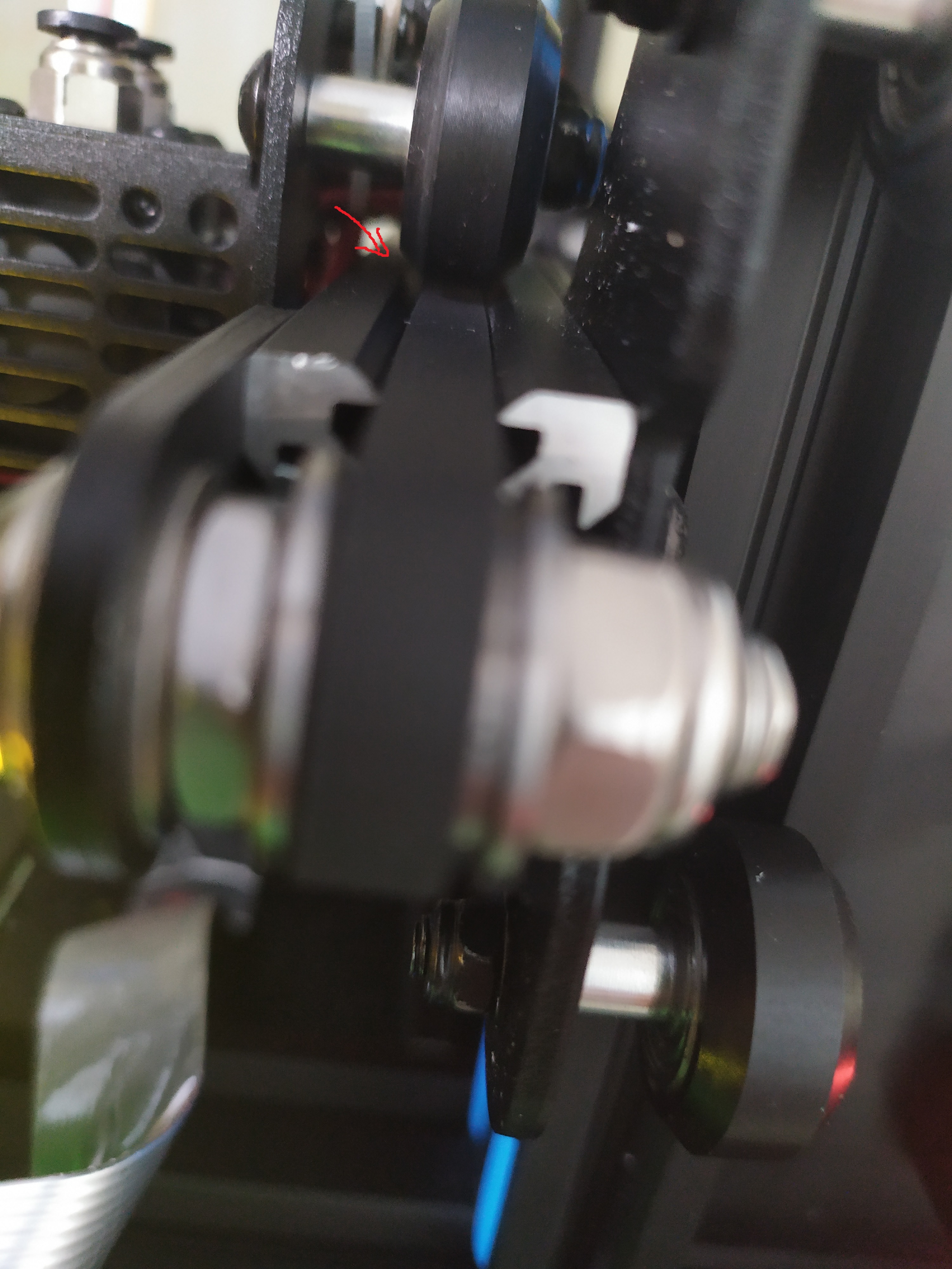 Вот фото того что роллик находиться на краю не на рельсе а на ремне. На видео видно что экструдер приподнимаеться над столом