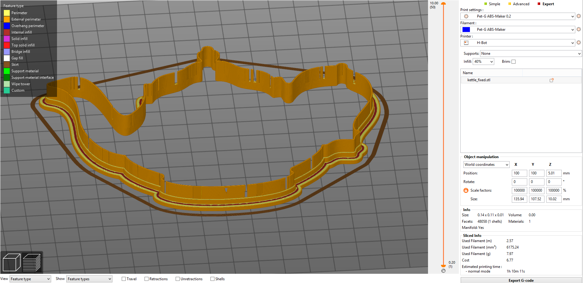 После фикса, модель стала мааааалюсенькой, пришлось отмасштабировать до 100000% чтобы разглядеть ее только... Отслайсил в прушаслайсере, все очень печально, еще хуже чем было