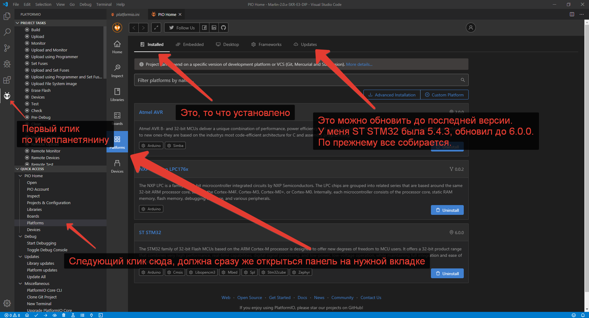 Может не из сети подгружает? Ну или глюк какой VScode... Попробуй подождать для начала, потом перезапустить. И в первую очередь закрой вторую вкладку PIO Home.