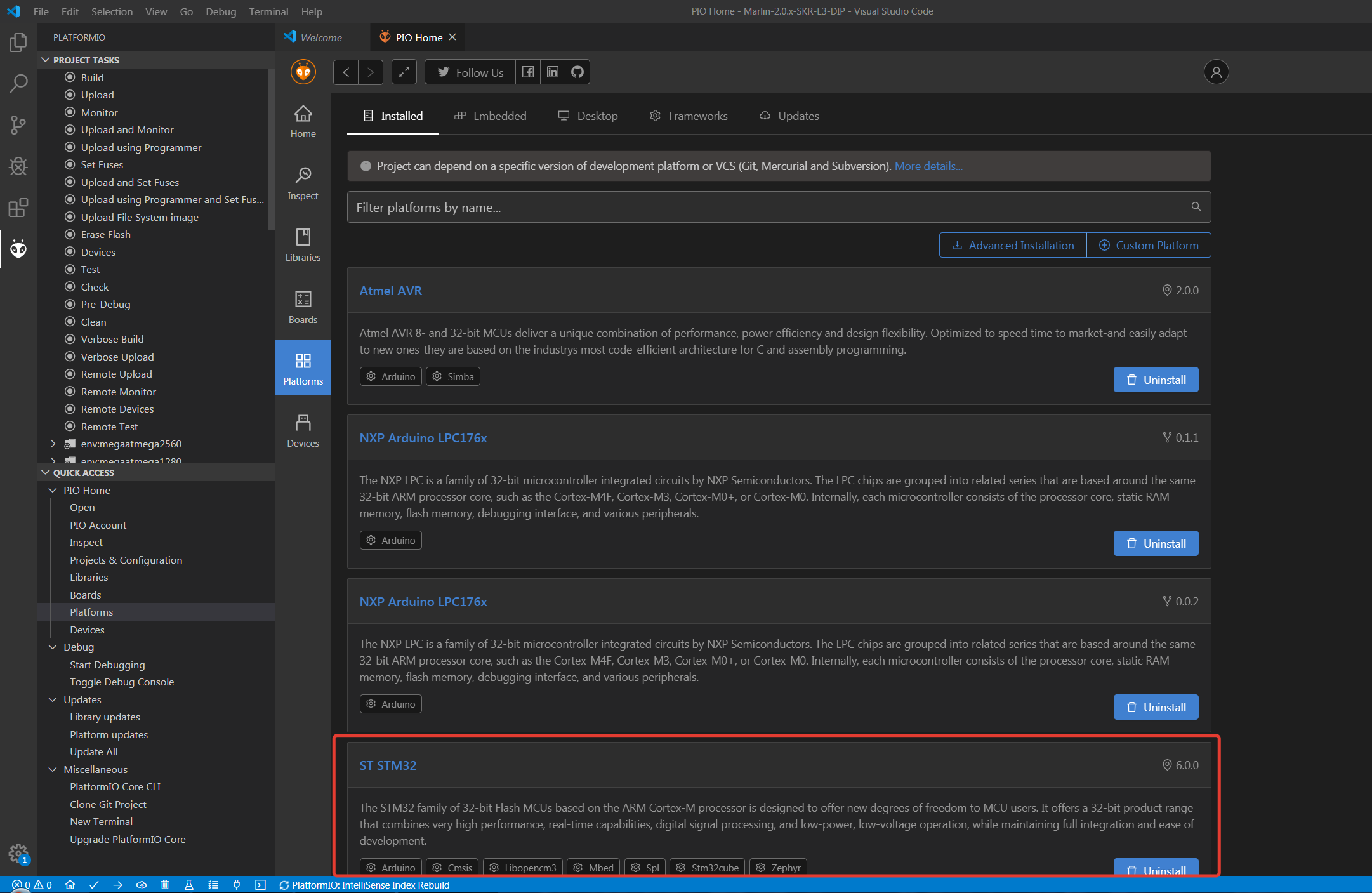 Стоило подгрузить исходники марлина, натравленные на STM32, даже до компиляции проекта соответствующая платформа уже появилась, причем последней версии.