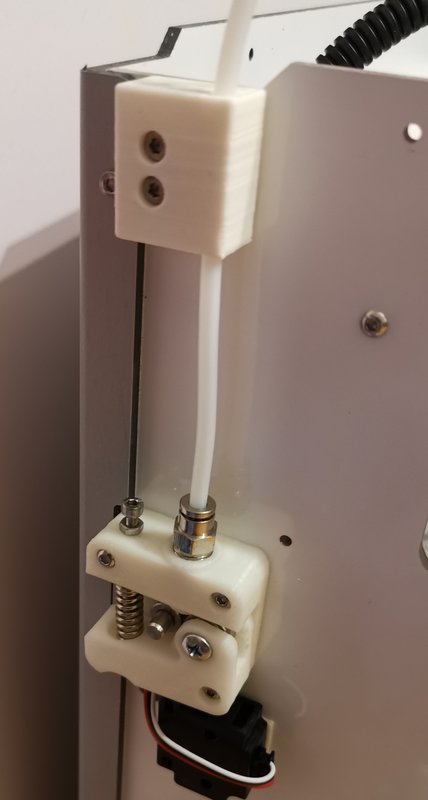 В принципе полезная штука, делал когда-то подобный тюнинг. Но оказалось, что фиксация трубки в кронштейне не полностью исключает застревание трубки в пневмофитинге. Потому что глубокая бороздка на трубке образуется в основном не из-за качания/вращения трубки, а от дёрганий ретрактами вверх-вниз. А степень застревания зависит от конструкции фитинга - на каких-то трубка вытаскивается, а на каких-то застревает напрочь. На штатном экструдере проблема легко решается вывинчиванием фитинга, проталкиванием трубки и обрезанием её конца выше бороздки.