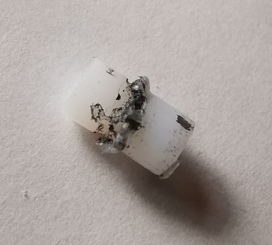Неприглядная картина проеденной трубки наводит на простую мысль: к такому состоянию её приводят колебания незакреплённого боудена при печати. Постоянно перемещающейся головой качает в фитинге вперёд-назад-влево-вправо... Для устранения этой беды смоделировал и распечатал два варианта держателя боудена.