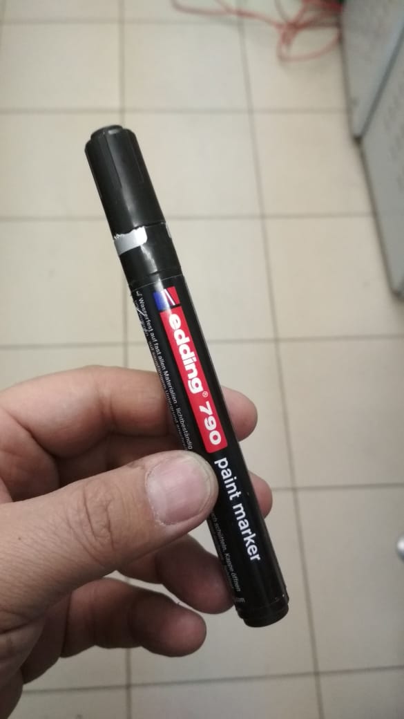 В общем, то - что надо. С нитрокраской, которая смачивает фетровый наконечник при нажатии маркером на поверхность. Закрепил маркер на корпусе шпинделя, сделал логотип фирмы, который нужно было нанести, выбрал в инструментах фрезу 3 мм (диаметр пятна, оставляемого маркером), в Estlcame сгенерировал gcode и - вперед...