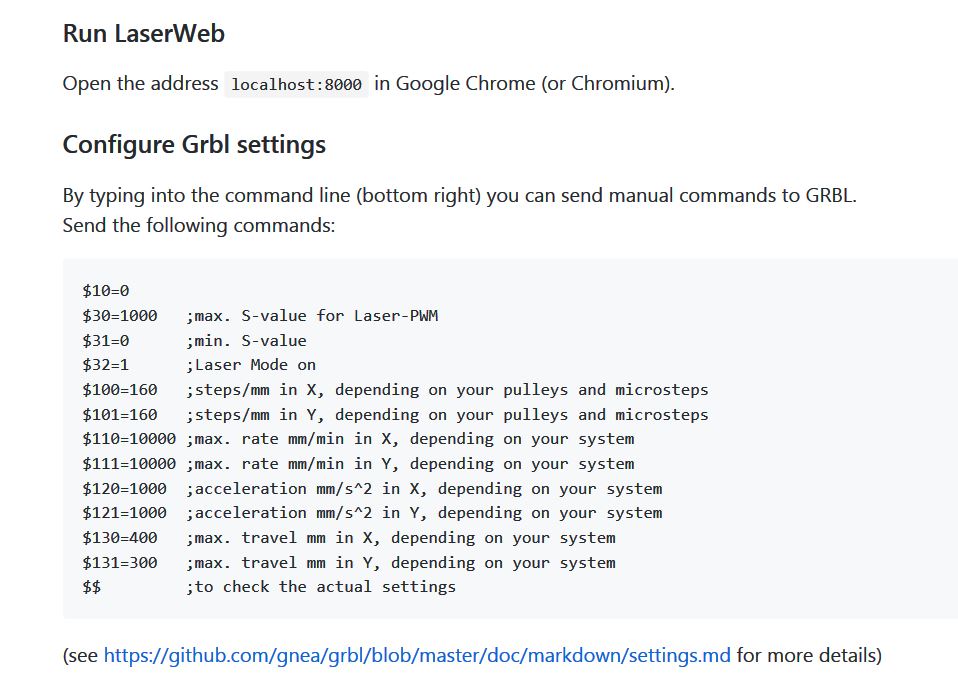 Для этого в строке программы ЛазерГРБЛ надо набрать "$$" - и вам в окне кодов выложатся настройки вашей прошивки (их кстати можно менять). Посмотрите документацию по GRBL вашей версии прошивки.