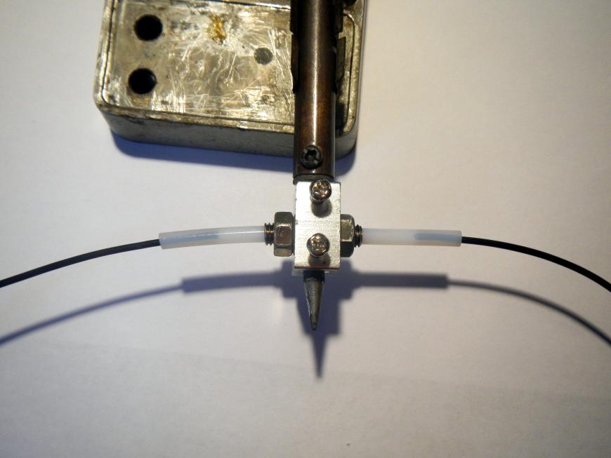 Закрепляется приспособление на жало паяльника, выставляется температура 220 – 240 градусов и вводятся два конца филамента с таким расчётом, чтобы они встретились в зане нагревателя и поджимаются друг к другу. Когда поджатие останавливается, сварка произошла. Паяльник выключается, остаётся ждать полного остывания.