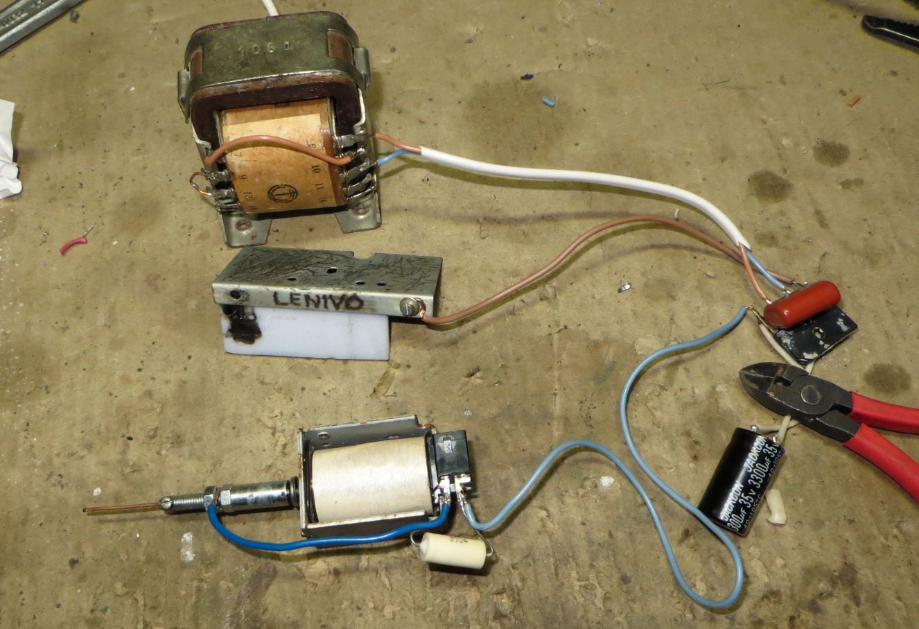 Тут электромагнит с сердечником и искровой элемент закреплен на пластинке пружинке - которая примагничивается к сердечнику электромагнита