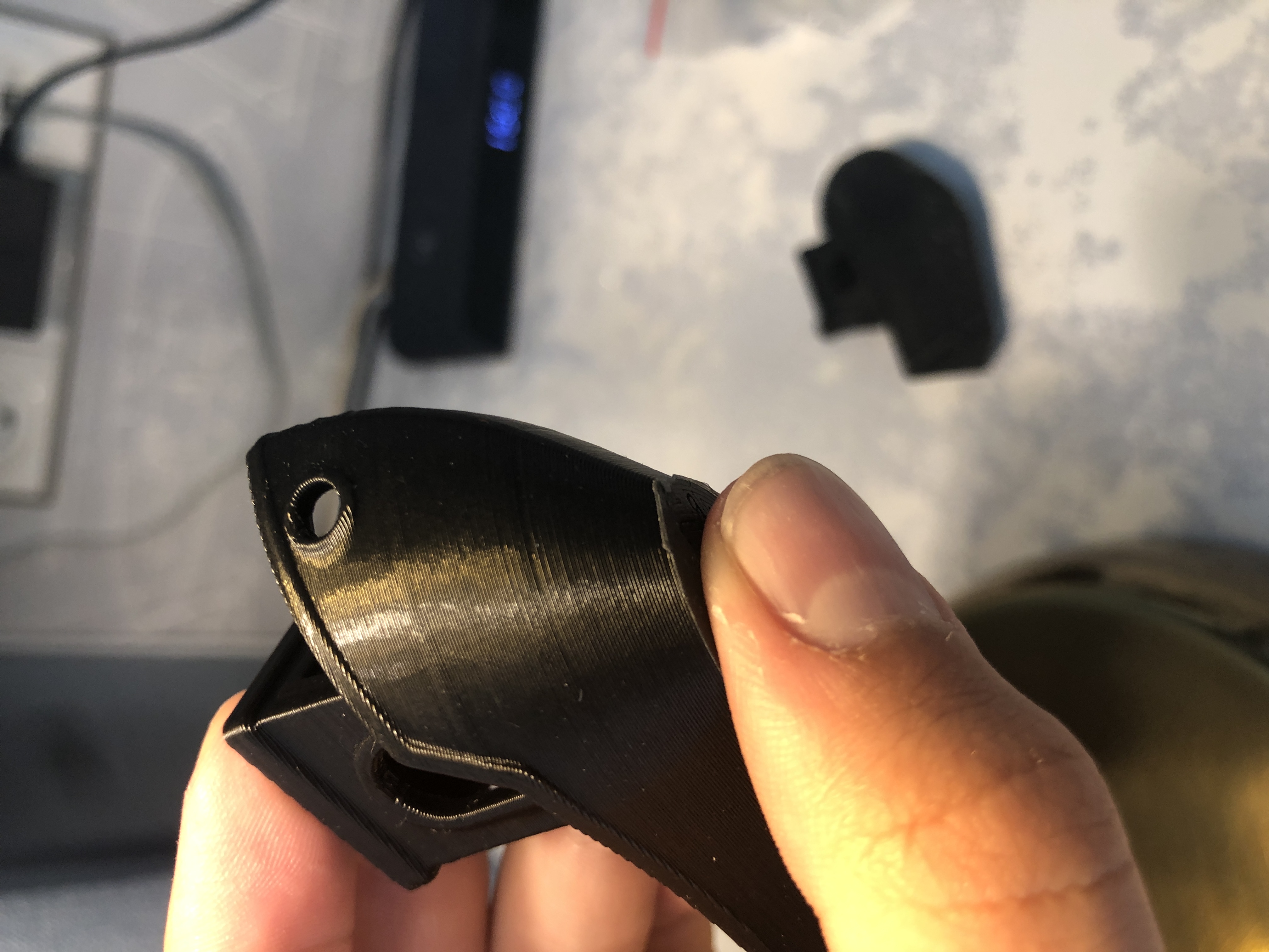 На верхней фотографии, на борту, похоже на недоэкструзию. Там где дверной проём, похоже не хватило охлаждения (или скорость печати высокая или вентиляторы медленно вращались) .