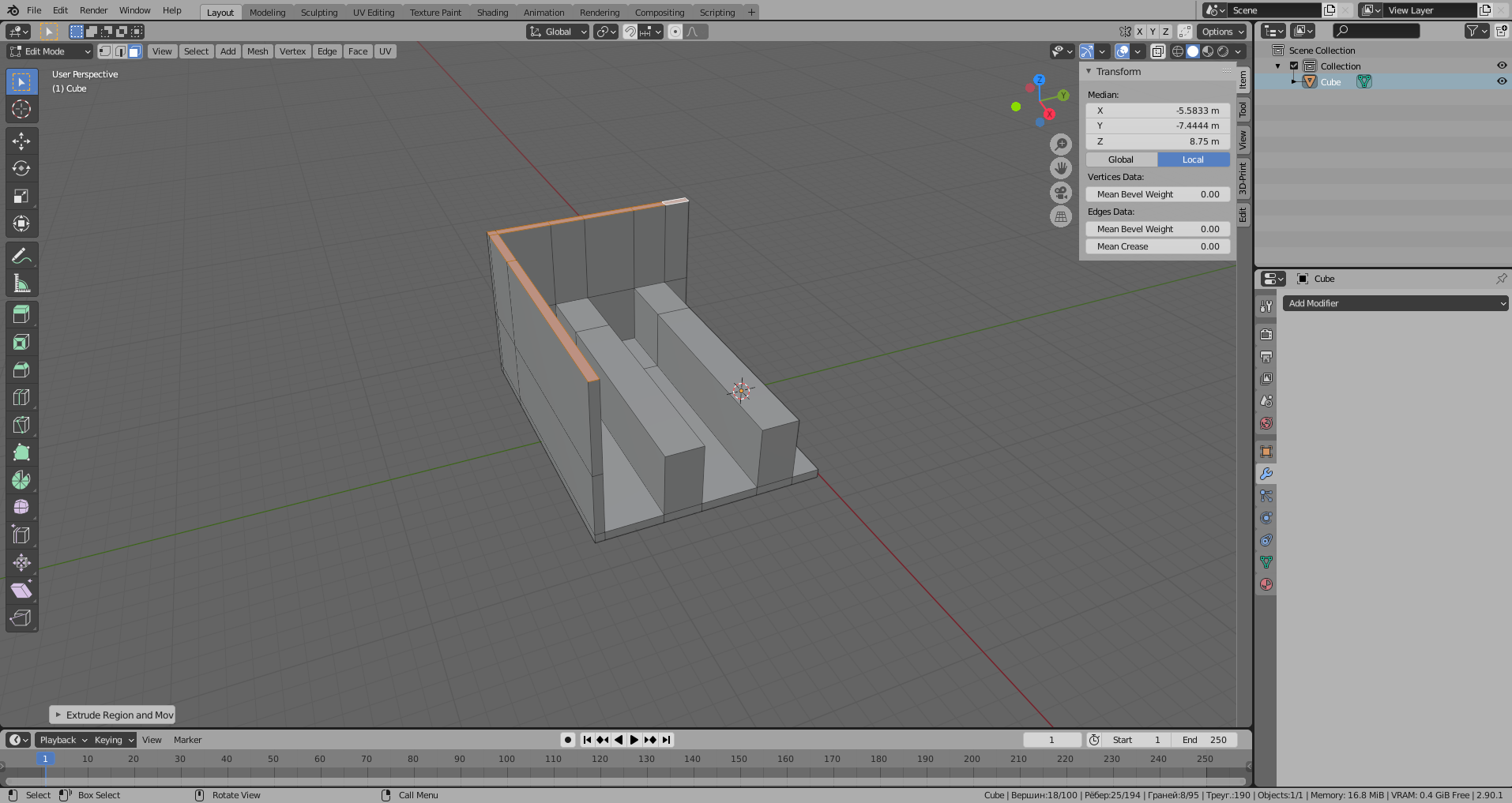"Alt+Z", "3" - выделяем лишние грани (Создались при "E"), "X" -> Faces. "A" - выделить все, "M" -> By Distance - удаление дубликатов вершин.