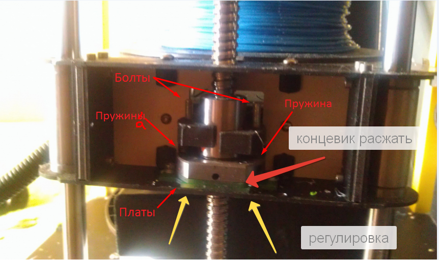 Датчик очень странный, внутри стола находятся 2 платы, которые работают просто на замыкание (тупо 2 дорожки на каждой для + и -). Эти платы соединены с двумя болтами с пружинами. При помощи этих болтов происходит размыкание плат (одна просто поднимается над другой). Для меня непонятно, каким образом принтер может разомкнуть эти платы, ведь для этого надо приложить усилие откуда-то....