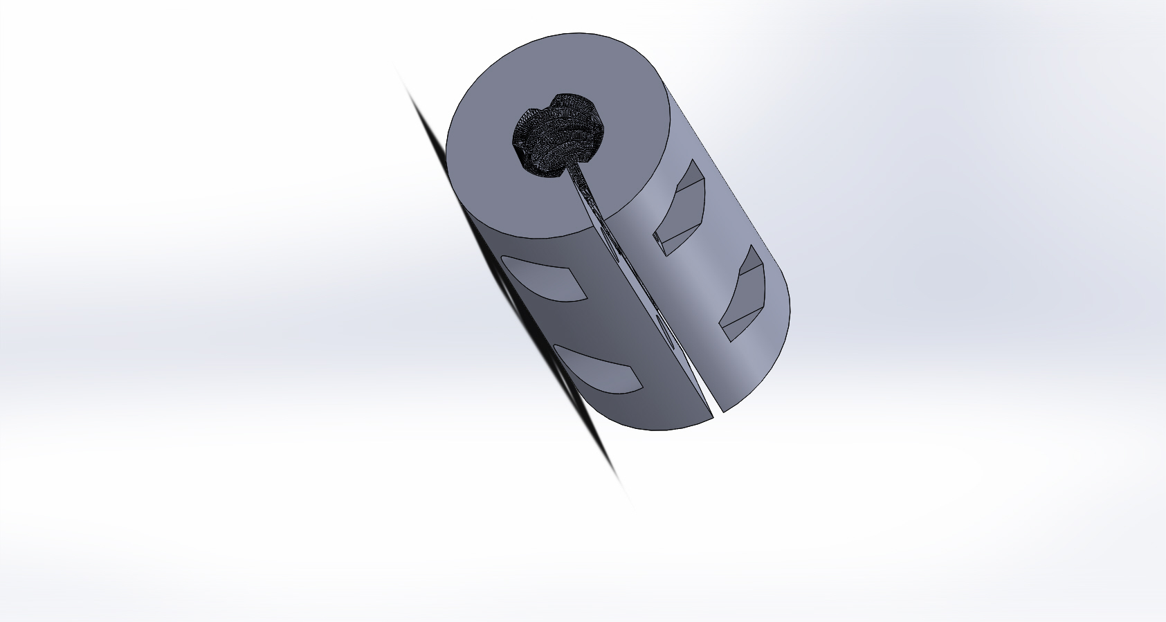 Вот "разрезная" муфта с зажимом с винтом и гайками - гайки надо утапливать паяльником в корпус или край спиливать напильником - иначе гайка цепляет за корпус ...... А так держит хорошо .... но чтобы налезла на резьбу надо ставить увеличение от расширения пластика при печати - я ставил подбором 6%. Причем увеличение по длине и ширине , а по высоте оставлял 100% - без увеличения.