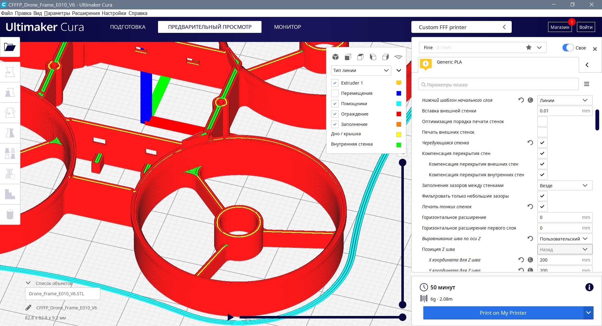 Как вариант, кстати, слайсер действительно сам режим вазы включил, увидев нулевое заполнение и стенку в один периметр. Для таких условий режим вазы самый оптимальный. Интересно, что выйдет, если увеличить толщину стенки до двух периметров, больше ничего не меняя.