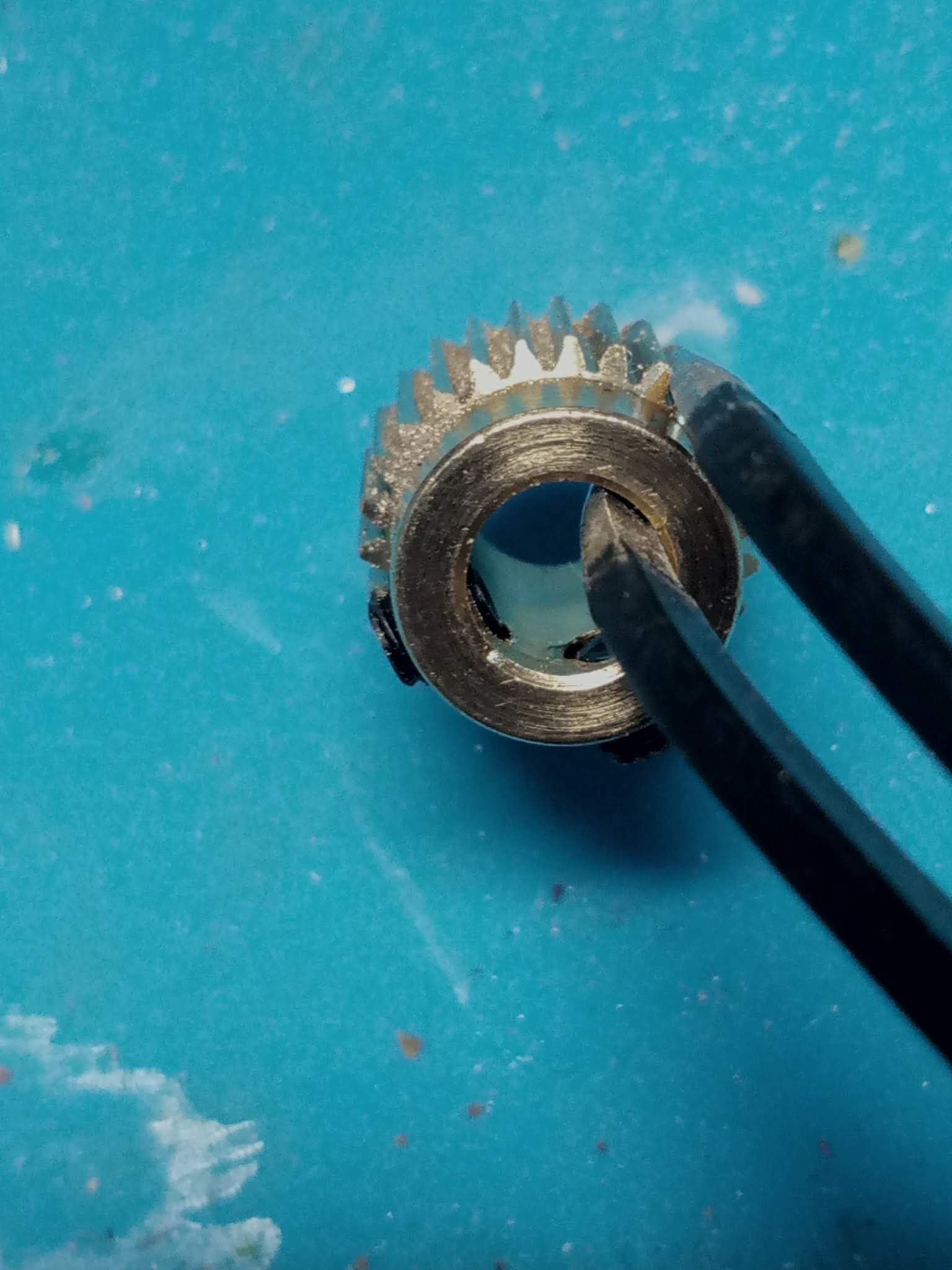 Заточил надфилем, нашелся у меня в наборе такой тонкий. До заточки шестерня выгляделя так: