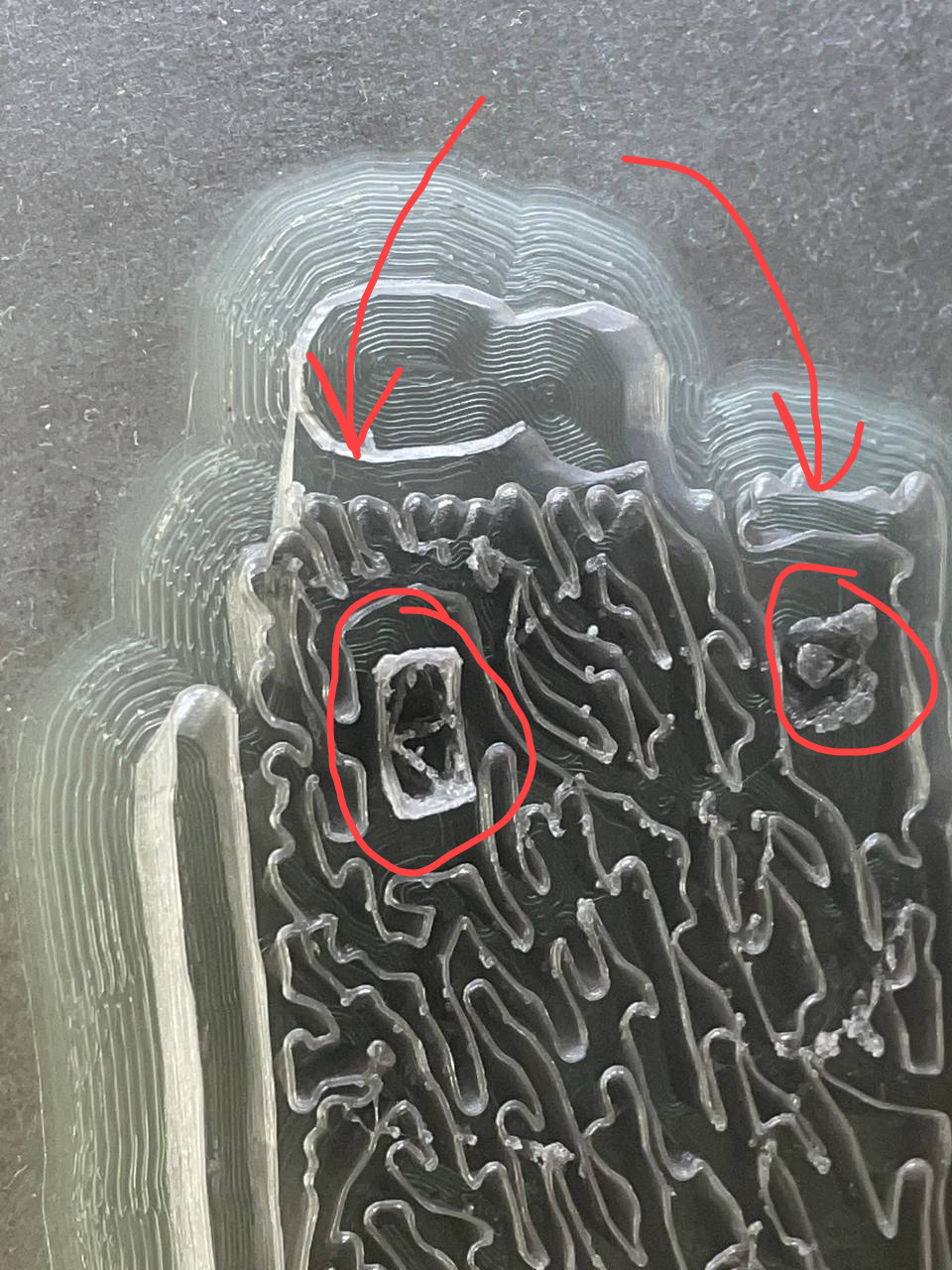 надо смотреть в слайсере рендер слоев и настройки, обычно так из-за того, что сопло наезжает на остывший пластик при пересечении уже напечатанных слоев, например так бывает при полном заполнении (когда на одном слое пропечатываются все линии заполнения, а не чередуются, не путать с процентом заполнения) сеткой больших площадей (хотя по логике не должно так как высота текущего слоя не меняется)