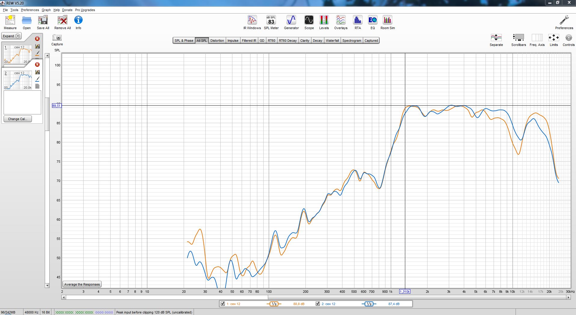 Реальную чувствительность померить не могу быстро - так как надо весь тракт настраивать по уровням это долго ..... да и шибко не нужно нужно вывести уровень динамиков примерно на один уровень..... А АЧХ приновровился мерять быстро - буквально всё подключить не более 10 минут. Радует что оба динамика одинаковые по измерениям. Провал на вч - это как я выяснил позже это я уронил свой микрофон и именно этот капсюль стал давать сбой...... Поэтому пришлось доставать свои другие микрофоны