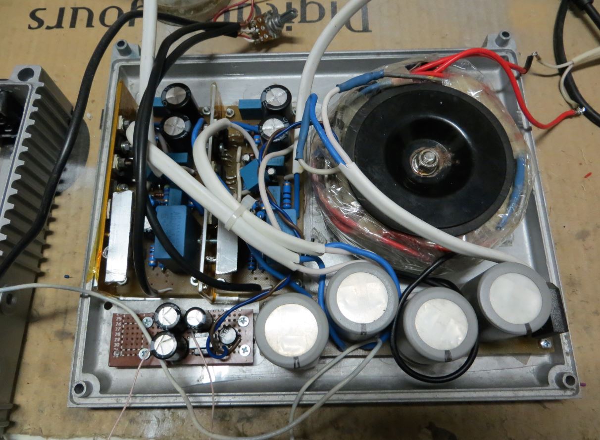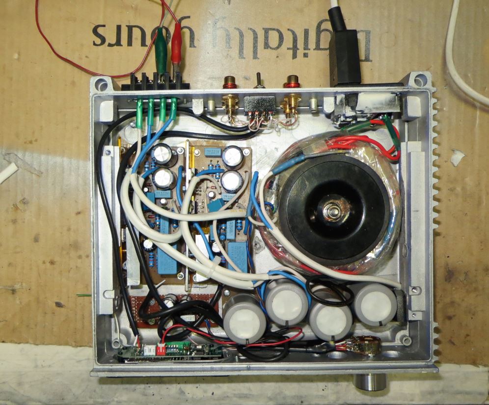 Спаял базовый вариант.... не хотел его улучшать.... Но без минимальных улучшений даже слушать на прогреве не смог. Минимальные улучшения - это четыре конденсатора, входной разделительный, конденсатор входного фильтра и два шунта -полистирол на конденсаторы питания. И поставил провода по 1,5 кв. мм. - заменил провода 0,5 кв.мм - питание и выход на колонки. Провода дали динамику - звук стал "лёгкий" сразу...... С трансом опять не повезло большой трансформатор гудит - слышно если ухо к корпусу приложить или в абсолютной тишине... НАшёл смешно - легкий фон, думал из колонок.... дела мероприятия по устранению фона... Но однажды включил усилитель, а колонки не были подключены проводами, а фон остался..... оказалось тихий звук гудения трансформатора, Откручиваешь трансформатор от корпуса -гудежа нет, затянешь прижим тора к корпусу - легкий гудеж появляется - от корпуса..... Потом выключил питание усилителя .... блин- а фон остался.... оказалось это холодильник на кухне работает :lol: :lol: :lol:
