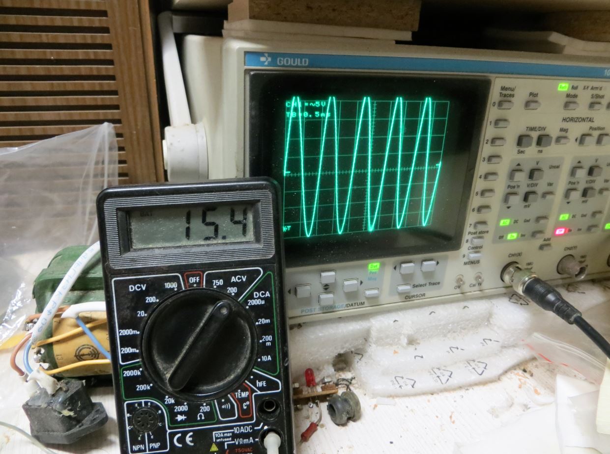 Ограничений нет по сигналу нет.... В принципе усиления можно ещё поддать но не надо. - У меня вышло 23,7 ватта на одном канале - это если мерить прибором - на фото прибор подсоединён к осциллографу. На осциллогафе выставлено 5 вольт на квадрат - максимум далее надо делитель подключать. Вылет амплитуды по одной оси 22 вольта - а напряжение питания +- 28 - с то есть максимум усиления подобран правильно и не доходит до ограничения по напряжению питания, даже с учётом падения напряжения на транзисторе.... Ток примерно 1,5 ампера - то есть с трансформатора на максимуме снимается 60 ватт +10 ватт на источник - 70 ватт ..... То есть у у меня силовая домотана 1 мм проводом - а на самом трансформаторе либо толще либо такое же сечение. То есть он работает на нагрузке 3А на мм.кв. - то есть вполне себе такой мало нагруженный режим даже на максимуме мощности.... а на рабочей мощности - его параметры с хорошим запасом.